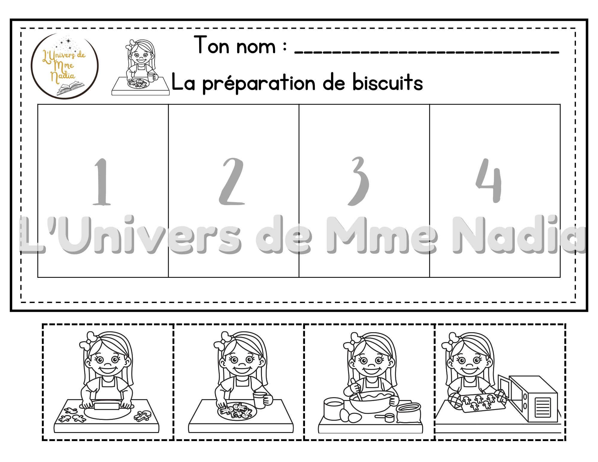 • Version avancée (grands) : on découpe, on colle les images dans le bon ordre et on écrit une phrase pour décrire chaque étape.