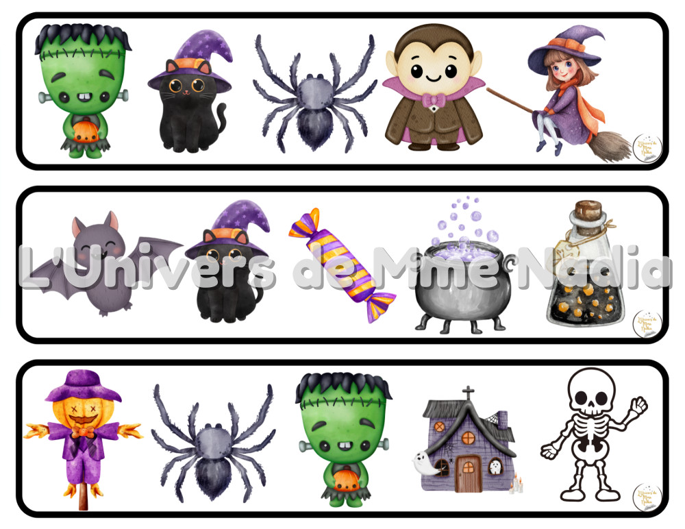 • 1 planche de jeu avec 16 images thématiques (Frankenstein, chat noir, araignée, vampire, sorcière, etc.).