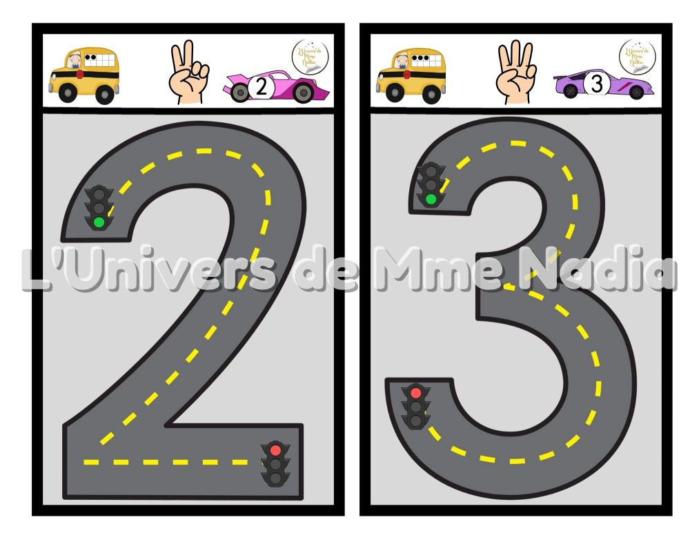 Pour accompagner leur nouveau plateau Feu de circulation, Ébénisterie Steve Genesse m'a demandé de faire une version en noir et blanc de Sur la route des nombres. Chaque nombre est représenté sous forme de route (avec départ et arrêt), et les enfants peuvent : tracer avec leur doigt, utiliser un crayon effaçable, ou encore suivre la route avec une petite voiture !