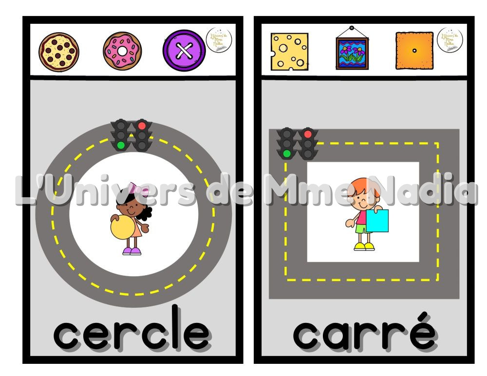 En haut de chaque carte, trois représentations des formes à travers des objets du quotidien.