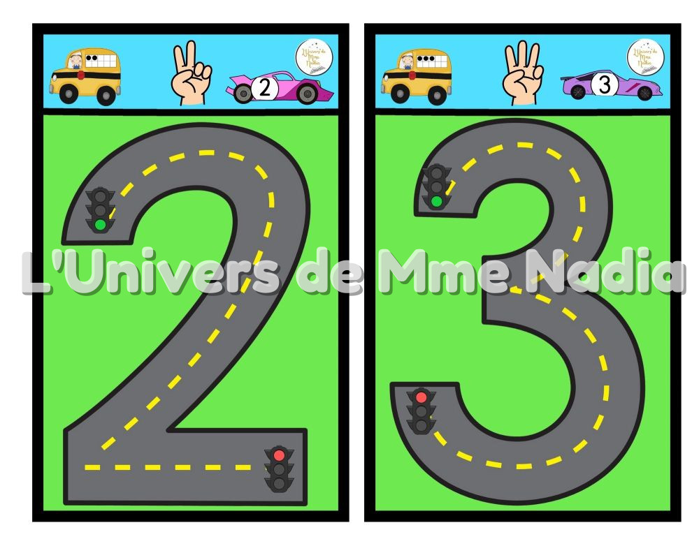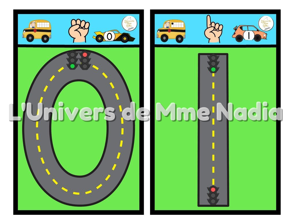 Après Sur la route de l’alphabet, voici la version pour les chiffres de 0 à 10 ! Chaque nombre est représenté sous forme de route (avec départ et arrêt), et les enfants peuvent : tracer avec leur doigt, utiliser un crayon effaçable, ou encore suivre la route avec une petite voiture ! En haut de chaque carte, trois représentations du nombre : un autobus avec une boîte de 10, la représentation avec les doigts, une voiture de course avec son numéro. Disponible en deux formats, parfait pour apprendre les chiffres en s’amusant, à la maison ou en classe. Idéal pour travailler la reconnaissance des chiffres, les quantités et la motricité fine.
