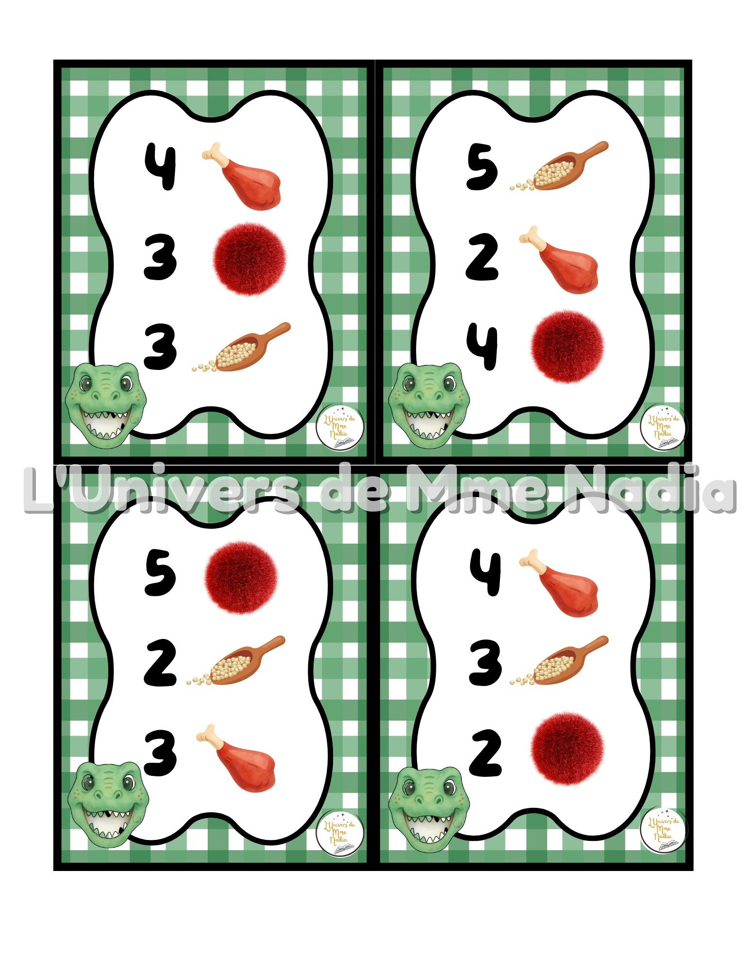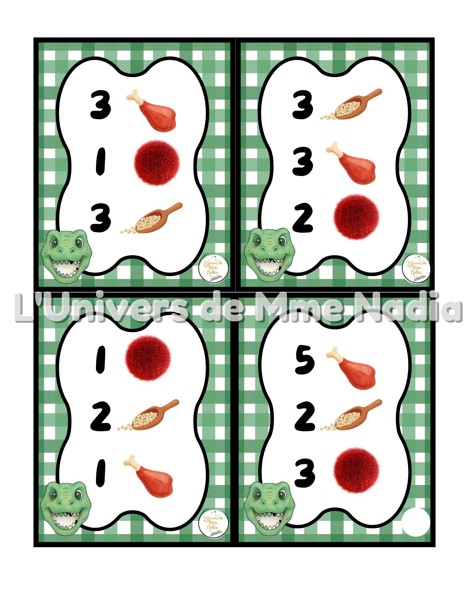Tyrannosaure a faim est un jeu complémentaire au plateau J'ai faim, créé par Ébénisterie Steve Genesse. Le jeu comprend 1 tête de tyrannosaure, 12 morceaux de viande et 32 petits menus conçus pour nourrir le tyrannosaure de façon ludique et éducative. Chaque carte propose un menu à réaliser avec différents éléments : • des morceaux de viande, • des pompons rouges, • et la possibilité d'ajouter des cuillères de mélange sensoriel. Les enfants sont invités à : • choisir le bon ingrédient, • mettre la bonne quantité, • et suivre les consignes du menu. Ce jeu permet de travailler les quantités, l'association, l'attention et la motricité fine, tout en ajoutant une dimension sensorielle et amusante. Avec ses 32 cartes toutes différentes, Tyrannosaure a faim offre une belle variété de défis pour enrichir l'utilisation du plateau J'ai faim.