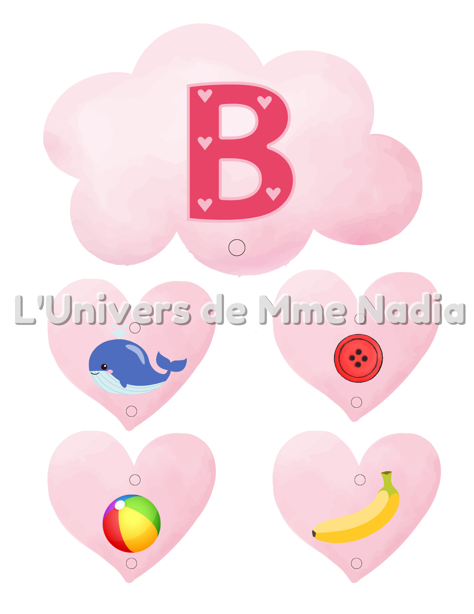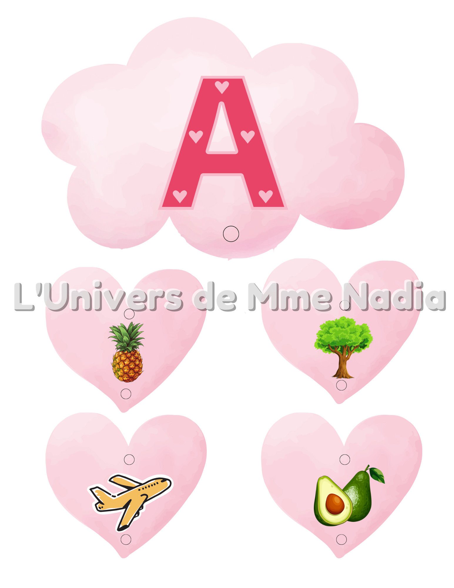 Une fois que vous aurez imprimé, plastifié ,découpé et poinçonné le document de 26 pages , l'élève devra, à l'aide de maillons, enchainer les coeurs- images au bon nuage.