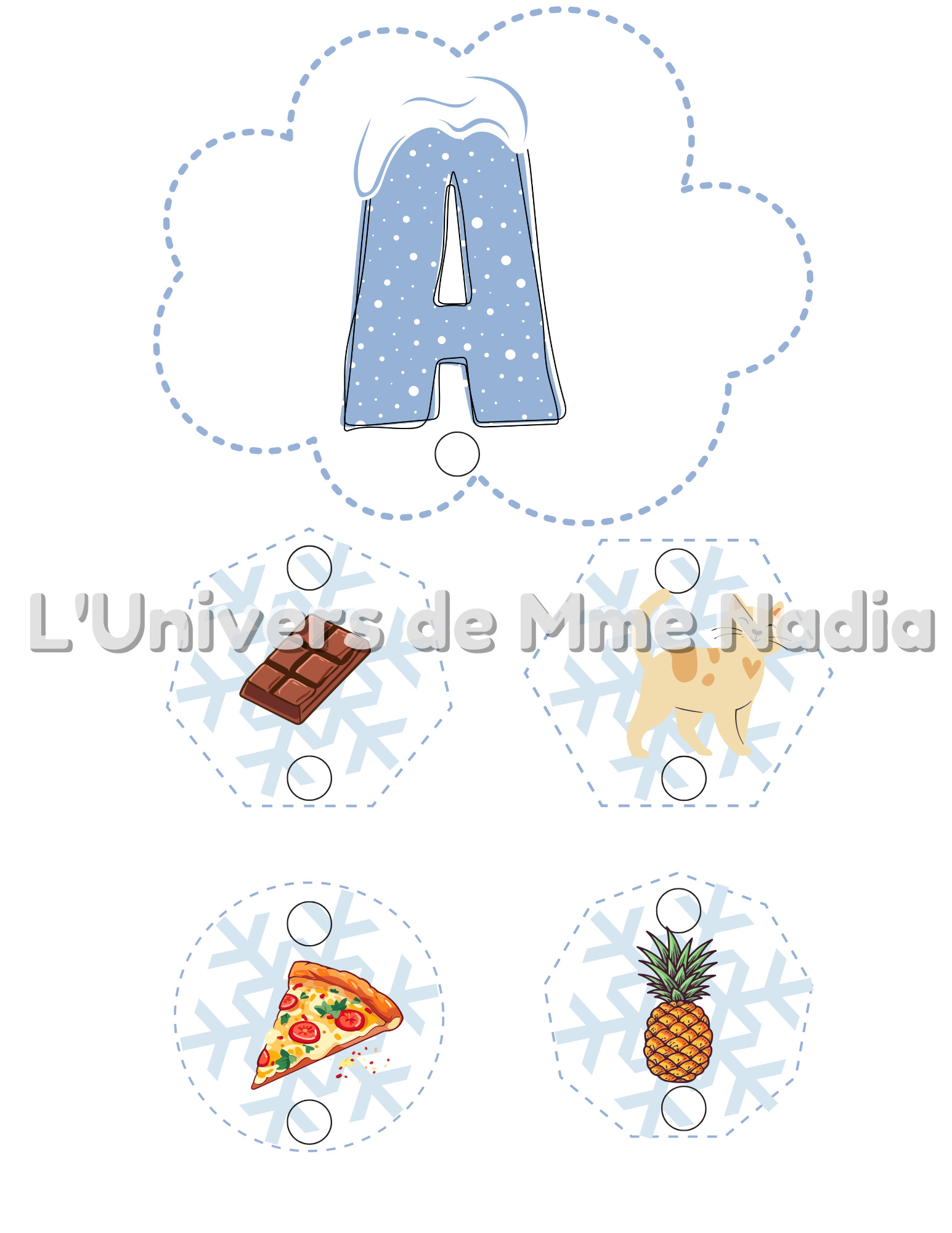 Une fois que vous aurez imprimé, plastifié ,découpé et poinçonné le document de 26 pages , l'élève devra, à l'aide de maillons, enchainer les flocons- images au bon nuage.