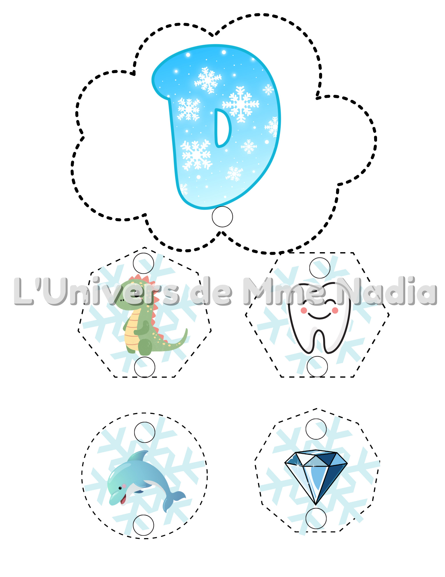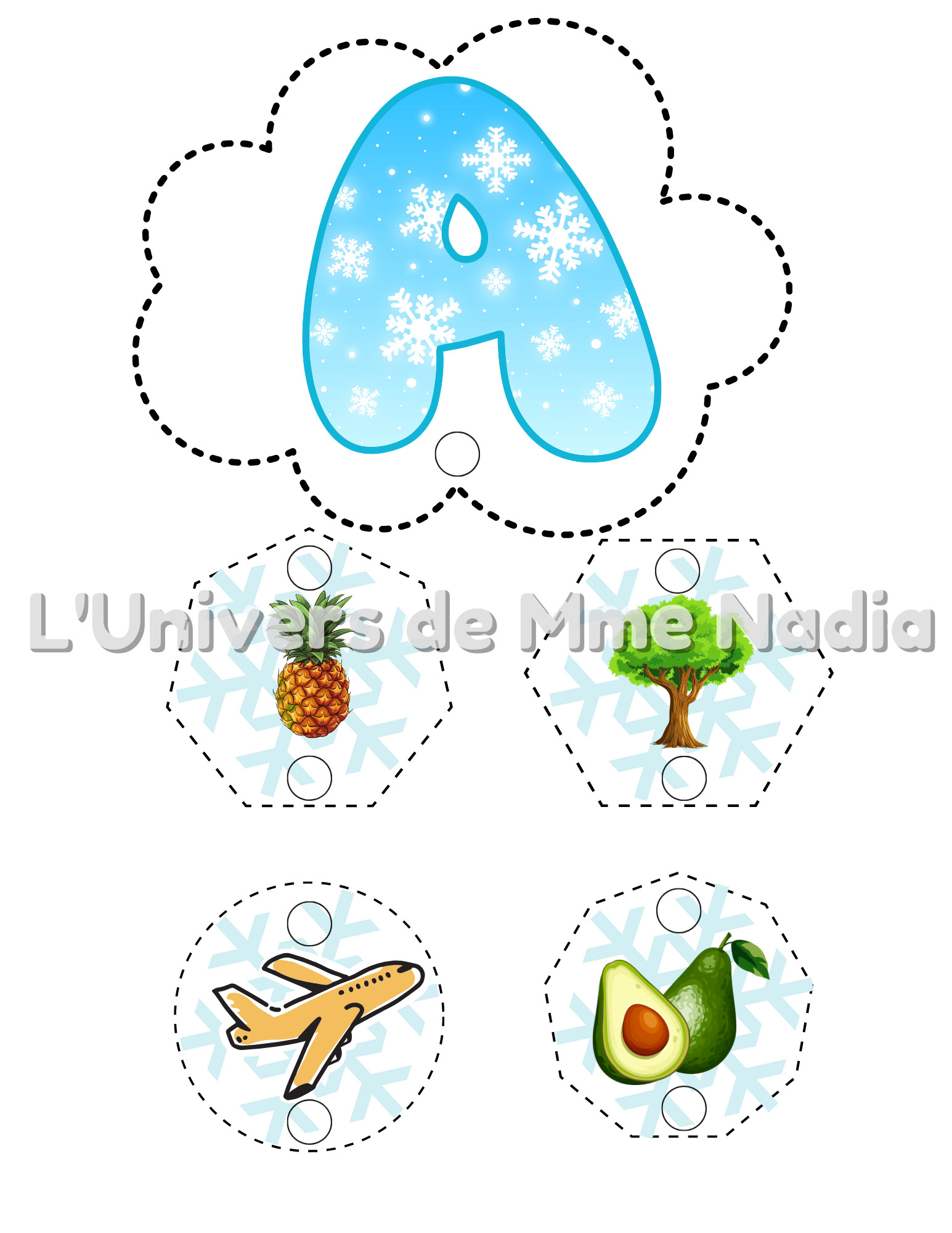 Une fois que vous aurez imprimé, plastifié ,découpé et poinçonné le document de 26 pages , l'élève devra, à l'aide de maillons, enchainer les flocons- images au bon nuage.