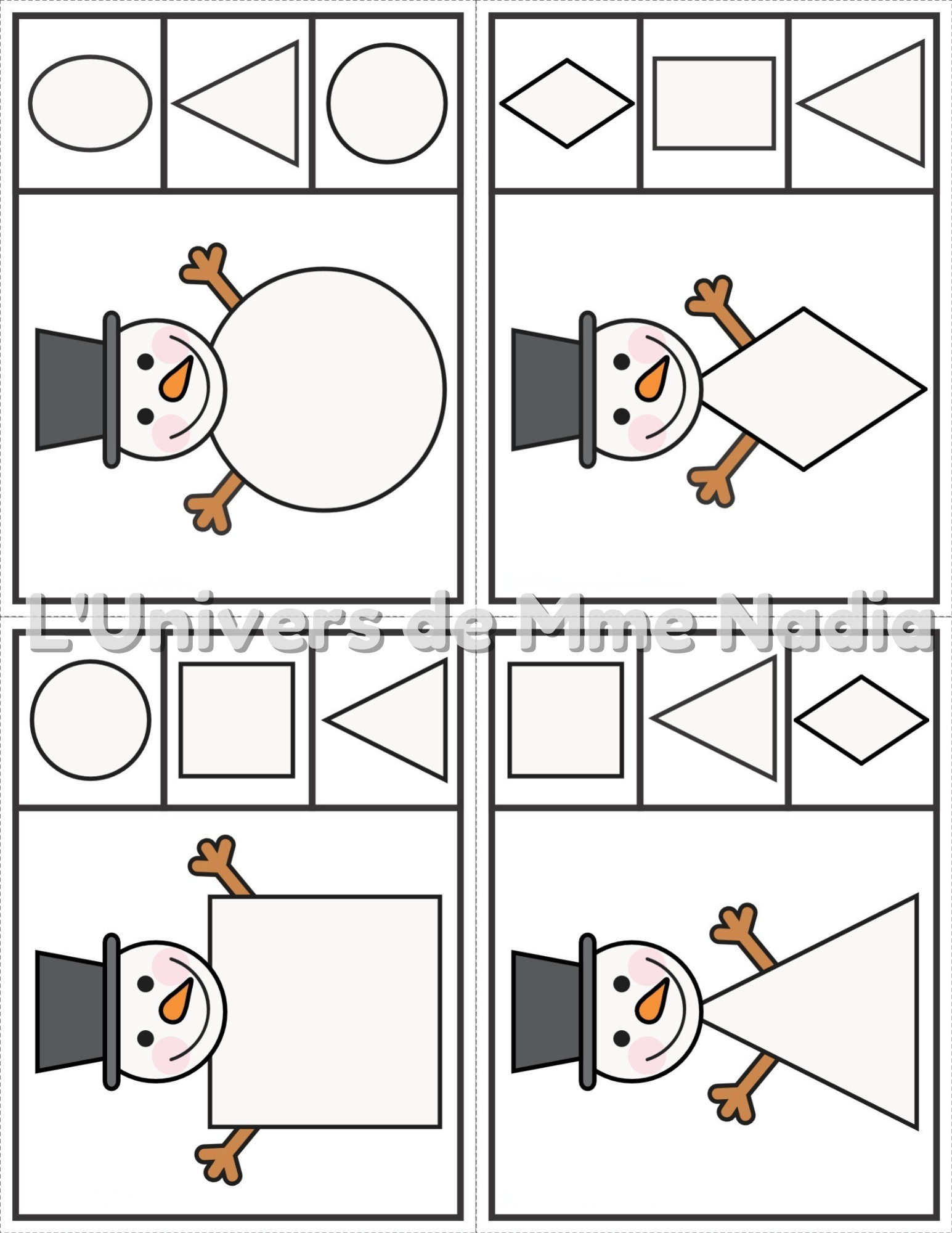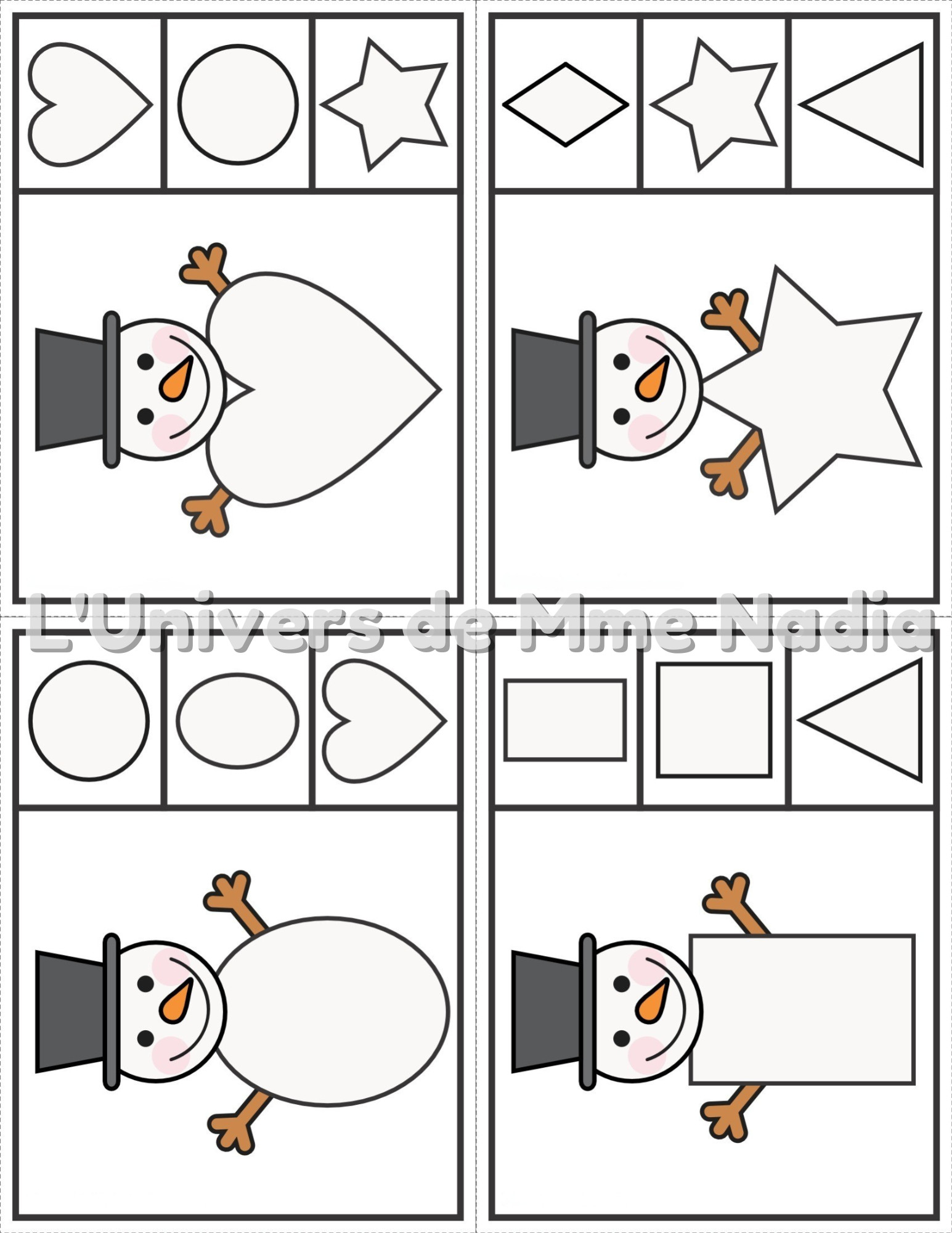 Voici une belle activité toute simple pour l'apprentissage des formes géométriques. L'élève doit associer la bonne forme avec celle du corps du bonhomme de neige. Vous pouvez demander de pincer avec une épingle à linge, un trombone ou d'encercler avec un crayon effaçable à sec.