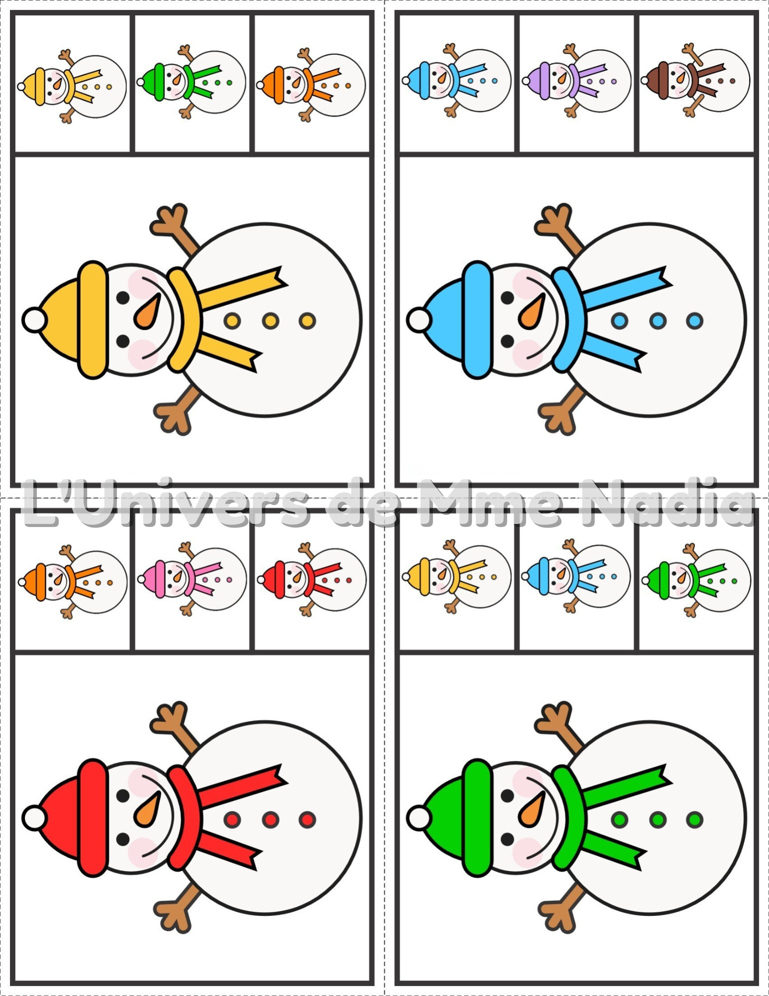 Voici une belle activité toute simple pour l'apprentissage des couleurs. L'élève doit associer la bonne couleur du bonhomme de neige avec celle du modèle. Vous pouvez demander de pincer avec une épingle à linge, un trombone ou d'encercler avec un crayon effaçable à sec.