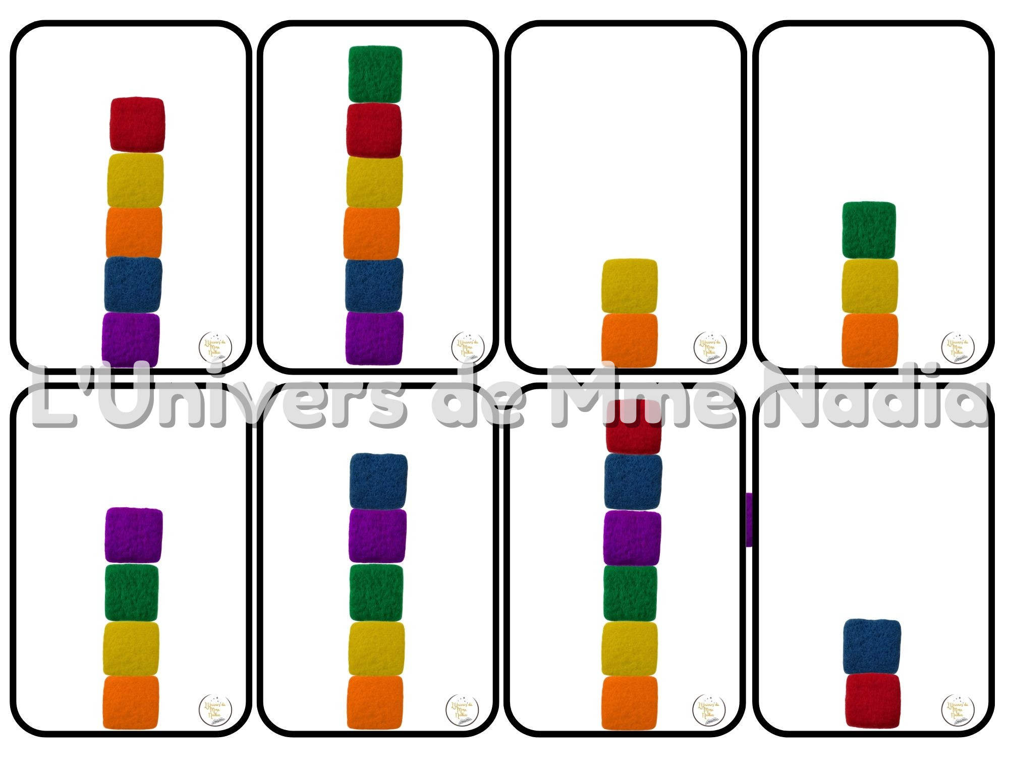 40 modèles de tours à reproduire, offrant une progression de 2 à 6 cubes pour travailler la motricité fine, la coordination œil-main, la logique (essais / erreurs) et la reconnaissance des couleurs.