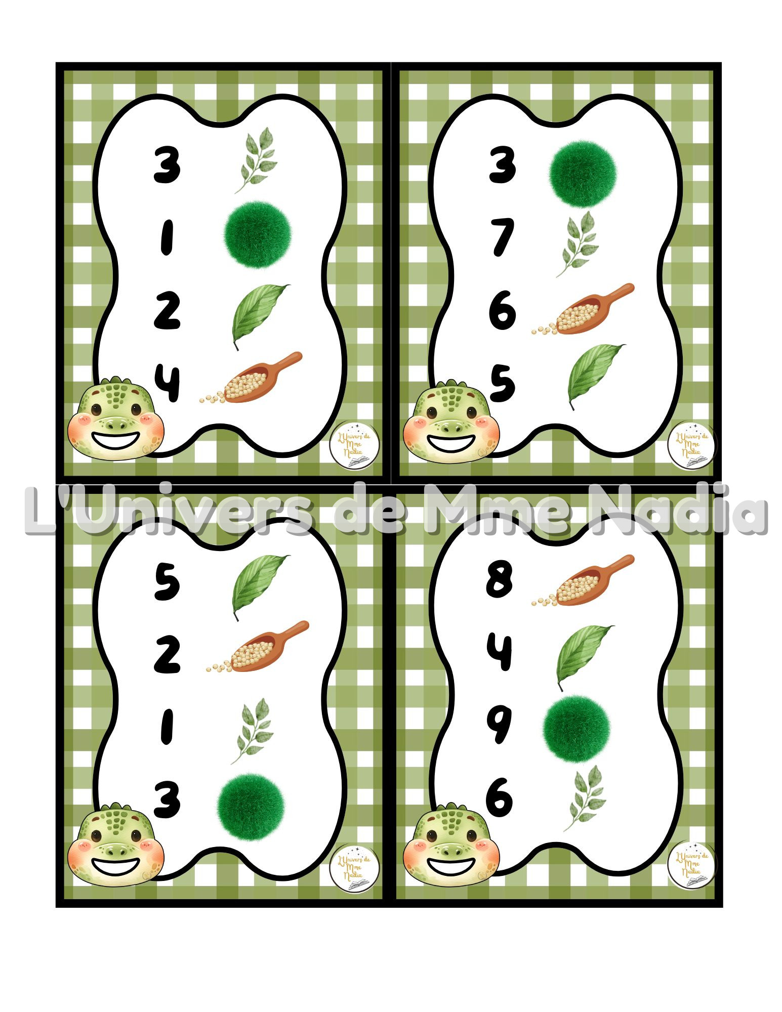 Le Diplodocus a faim est un jeu complémentaire au plateau J'ai faim, créé par Ébénisterie Steve Genesse. Le jeu comprend 1 tête de tricératops, 24 feuilles et 32 petits menus conçus pour nourrir le dinosaure de façon ludique et éducative. Chaque carte propose un menu à réaliser avec différents éléments : • trois sortes de feuilles • des pompons verts et la possibilité d'ajouter des cuillères de mélange sensoriel. Les enfants sont invités à : • choisir le bon ingrédient, • mettre la bonne quantité, • et suivre les consignes du menu. Ce jeu permet de travailler les quantités, l'association, l'attention et la motricité fine, tout en ajoutant une dimension sensorielle et amusante. Avec ses 32 cartes toutes différentes, Le Diplodocus a faim offre une belle variété de défis pour enrichir l'utilisation du plateau J'ai faim.