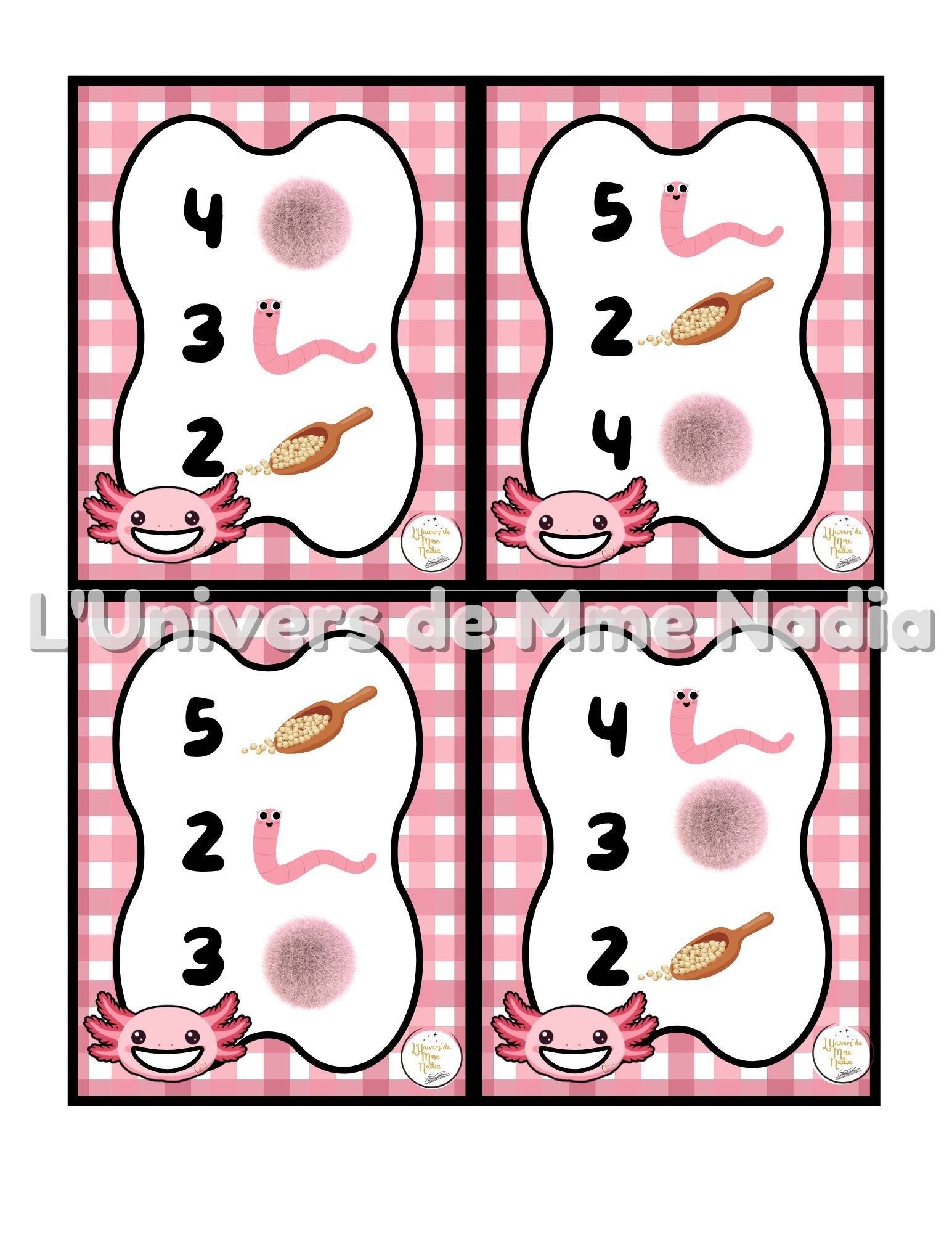 Axolotl a faim est un jeu complémentaire au plateau J'ai faim, créé par Ébénisterie Steve Genesse. Le jeu comprend 1 tête d'Axolotl, 12 vers de terre et 32 petits menus conçus pour nourrir l'Axolotl de façon ludique et éducative. Chaque carte propose un menu à réaliser avec différents éléments : • des vers de terre, • des pompons, • et la possibilité d'ajouter des cuillères de mélange sensoriel. Les enfants sont invités à : • choisir le bon ingrédient, • mettre la bonne quantité, • et suivre les consignes du menu. Ce jeu permet de travailler les quantités, l'association, l'attention et la motricité fine, tout en ajoutant une dimension sensorielle et amusante. Avec ses 32 cartes toutes différentes, Axolotl a faim offre une belle variété de défis pour enrichir l'utilisation du plateau J'ai faim.