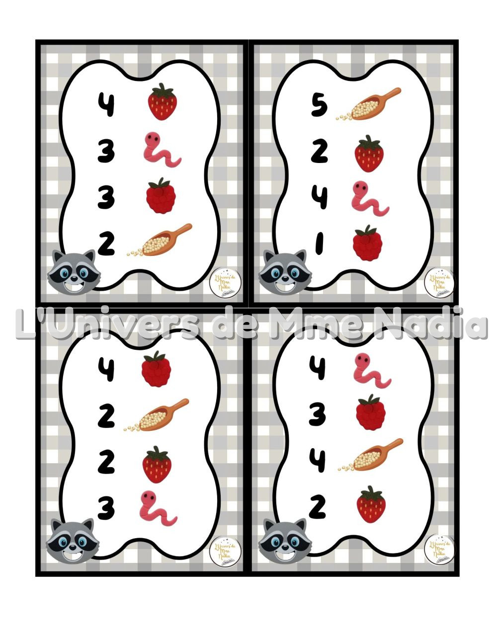 Le raton laveur a faim est un jeu complémentaire au plateau J'ai faim, créé par Ébénisterie Steve Genesse. Le jeu comprend 32 petits menus conçus pour nourrir le raton laveur de façon ludique et éducative. Chaque carte propose un menu à réaliser avec différents éléments : • des framboises et des fraises • des vers de terre et la possibilité d'ajouter des cuillères de mélange sensoriel. Les enfants sont invités à : • choisir le bon ingrédient, • mettre la bonne quantité, • et suivre les consignes du menu. Ce jeu permet de travailler les quantités, l'association, l'attention et la motricité fine, tout en ajoutant une dimension sensorielle et amusante. Avec ses 32 cartes toutes différentes, Le raton laveur a faim offre une belle variété de défis pour enrichir l'utilisation du plateau J'ai faim.