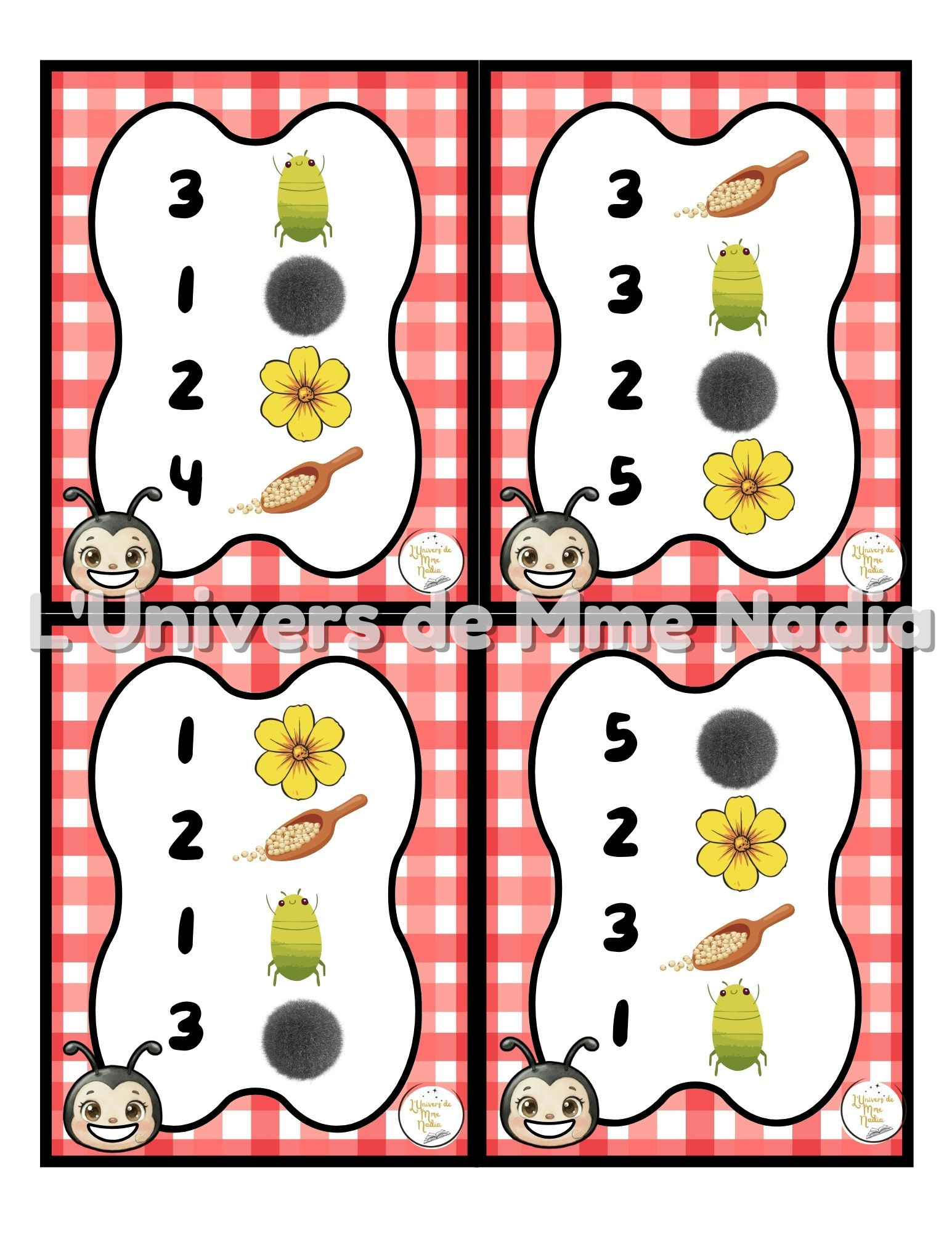 La coccinelle a faim est un jeu complémentaire au plateau J'ai faim, créé par Ébénisterie Steve Genesse. Le jeu comprend 1 tête de coccinelle, 10 fleurs, 10 pucerons et 32 petites recettes conçues pour nourrir la coccinelle de façon ludique et éducative. Chaque carte propose un menu à réaliser avec différents éléments : • des fleurs, • des pucerons, des pompons, • et la possibilité d'ajouter des cuillères de mélange sensoriel. Les enfants sont invités à : • choisir le bon ingrédient, • mettre la bonne quantité, • et suivre les consignes du menu. Ce jeu permet de travailler les quantités, l'association, l'attention et la motricité fine, tout en ajoutant une dimension sensorielle et amusante. Avec ses 32 cartes toutes différentes, Coccinelle a faim offre une belle variété de défis pour enrichir l'utilisation du plateau J'ai faim.