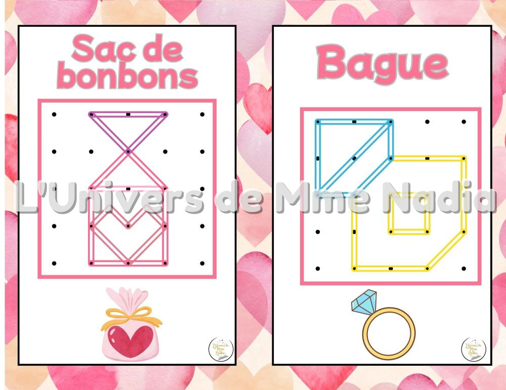 Découvrez mes 12 modèles à reproduire sur Géoplan version Saint-Valentin. Ils sont spécialement conçus pour accompagner le plateau Géoplan d' Ébénisterie Steve Genesse. C'est un atelier pour travailler la motricité fine, l'observation, la concentration, la reproduction de figures, la localisation spatiale et le dénombrement.