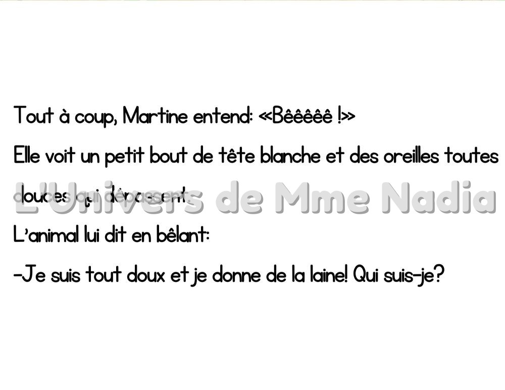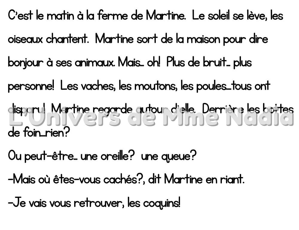Un matin, à la ferme de Martine, tous les animaux ont disparu ! En cherchant, Martine découvre des petites oreilles, des queues et des têtes qui dépassent… et commence à les retrouver un par un. À travers des devinettes amusantes, elle retrouve le mouton, le cochon, le poussin, la vache, le canard, le lapin, le cheval, la poule, le coq et l’âne. Tous réunis, ils chantent et jouent ensemble, et Martine commence désormais sa journée entourée de ses amis.