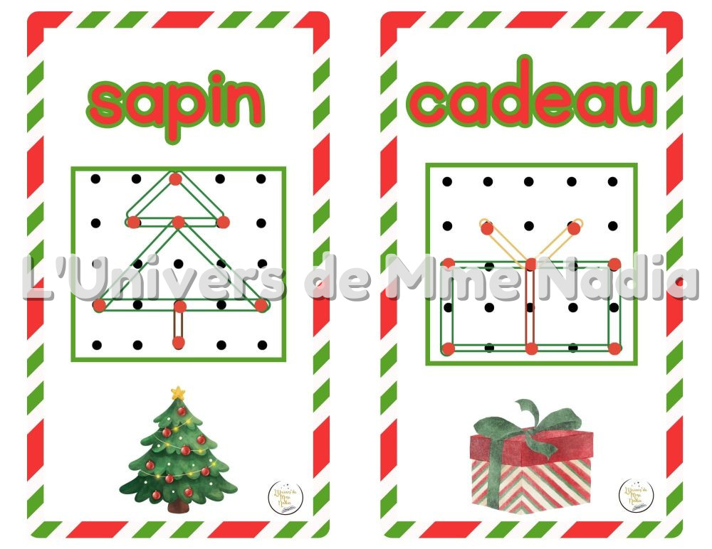 Découvrez mes 10 modèles à reproduire sur Géoplan version Noël. Ils sont spécialement conçus pour accompagner le plateau Géoplan d'Ébénisterie Steve Genesse. C'est un atelier pour travailler la motricité fine, l'observation, la concentration, la reproduction de figures, la localisation spatiale et le dénombrement.