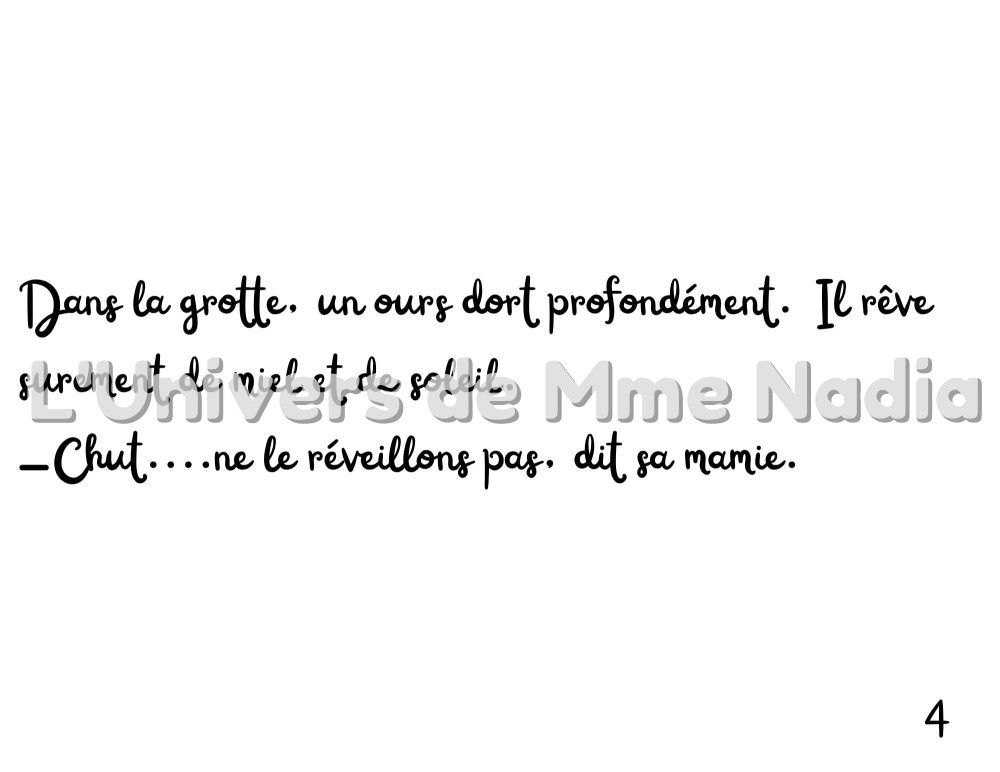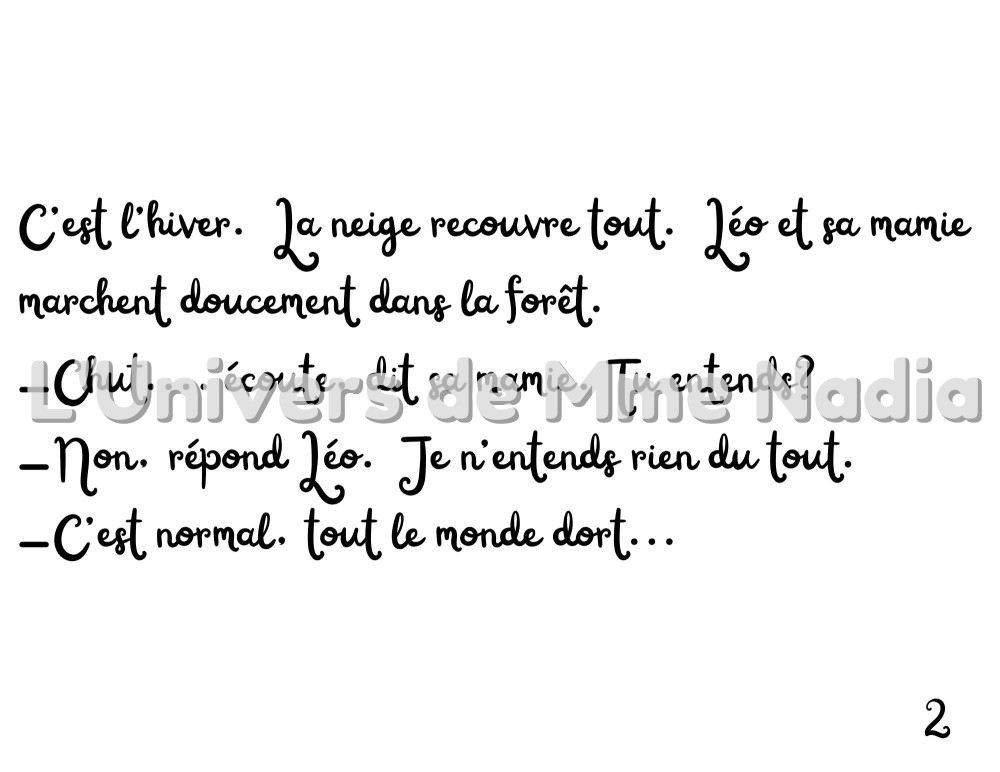 Léo et sa mamie se promènent doucement dans la forêt endormie. À chaque pas, Mamie lui dit : « Chut, écoute… » Et partout, ils découvrent les animaux qui dorment paisiblement : l’ours dans sa grotte, le renard sous sa queue, l’écureuil dans son arbre, la grenouille sous la glace, la tortue, le castor, la chauve-souris, la marmotte, le hibou, le poisson argenté et le petit hérisson. À la fin, Léo aussi baille… Il est temps pour lui de dormir, car, cette nuit-là, tout le monde dort.