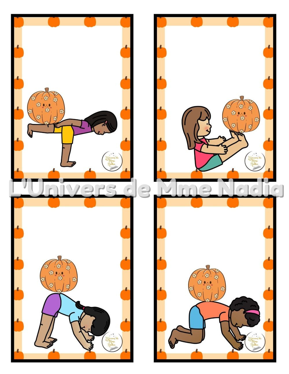 Le Yoga des Citrouilles ! 12 cartes de postures de yoga rigolotes… mais avec une surprise : une citrouille qui se cache toujours quelque part ! Sur le dos, dans les mains, sur la tête… sauras-tu la tenir en place ? Un jeu drôle et simple pour bouger, rire et partager de bons moments. Prêt·e à relever le défi du Yoga des citrouilles ?