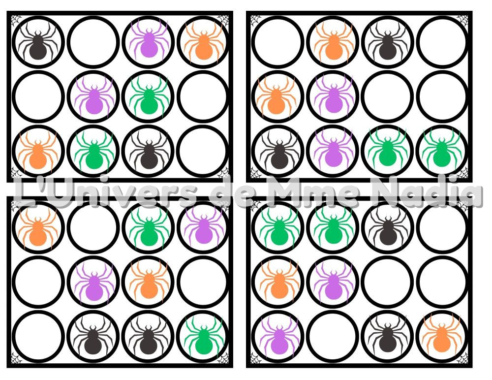 Offrez une activité ludique et éducative aux enfants avec ce jeu de reproduction de modèles sur le thème d’Halloween ! Sur chaque planche de 12 cases, l’enfant observe la disposition de 2 araignées noires, 2 vertes, 2 oranges et 2 violettes, puis doit reproduire le modèle à l’aide de petites araignées en plastique (facilement trouvables au magasin du dollar). Le document comprend 24 fiches variées à compléter.