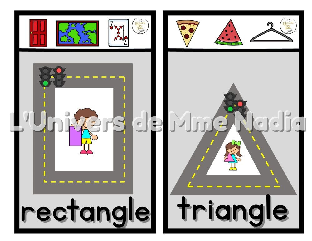 En haut de chaque carte, trois représentations des formes à travers des objets du quotidien.