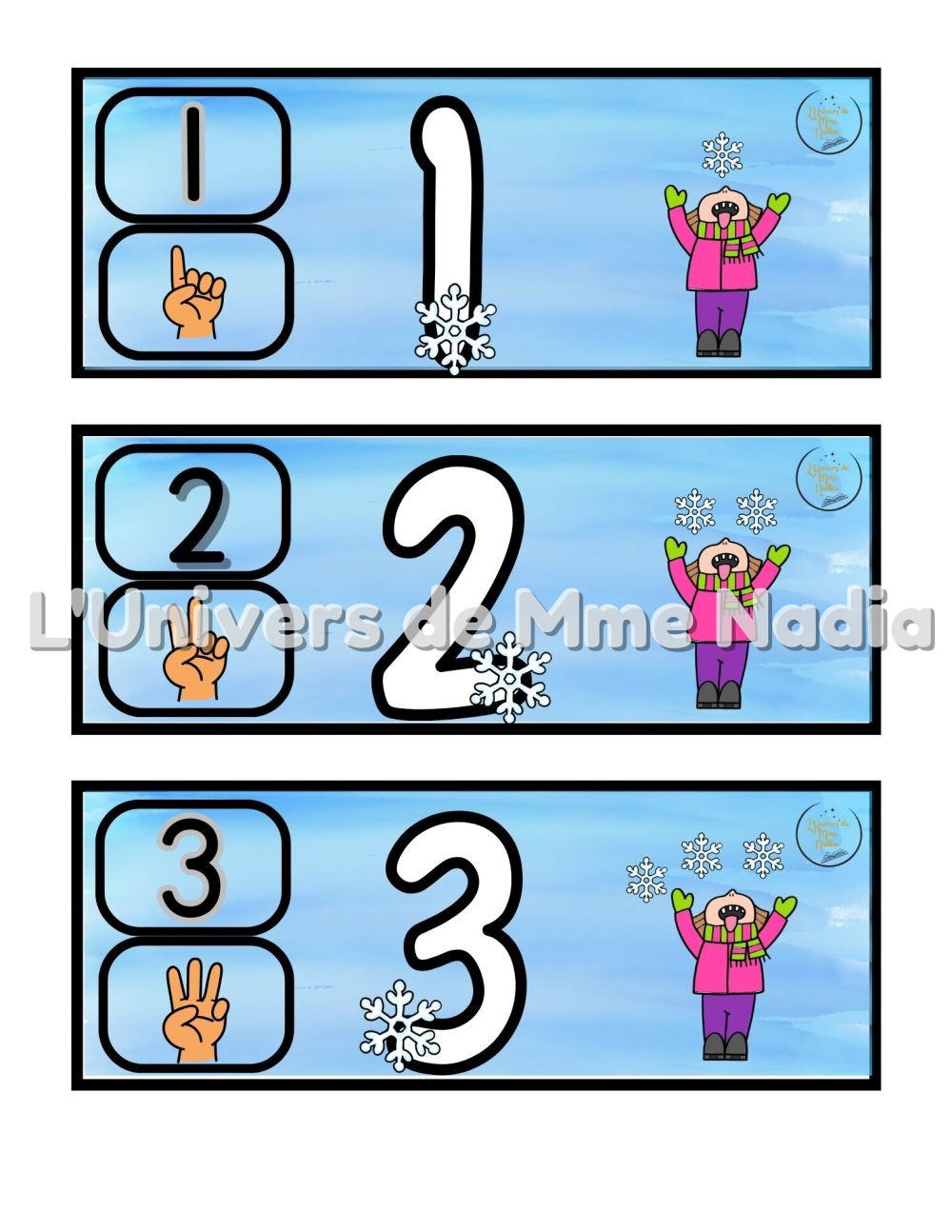 Cette activité éducative permet aux enfants de travailler les nombres de 1 à 10 à l’aide d’affiches sur le thème de l’hiver. Le matériel comprend 10 affiches, chacune présentant un nombre de 1 à 10 avec :
