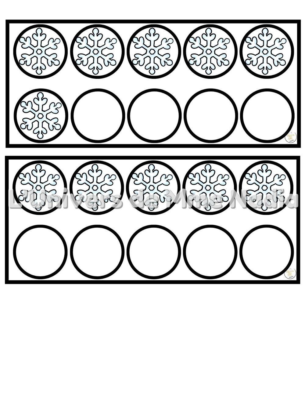 L’enfant utilise un plateau de boîte de 10 pour placer le bon nombre de flocons, favorisant le dénombrement et la correspondance quantité–chiffre. Une fiche complémentaire est incluse avec 10 cercles illustrant les quantités de 1 à 10 à l’aide de flocons.