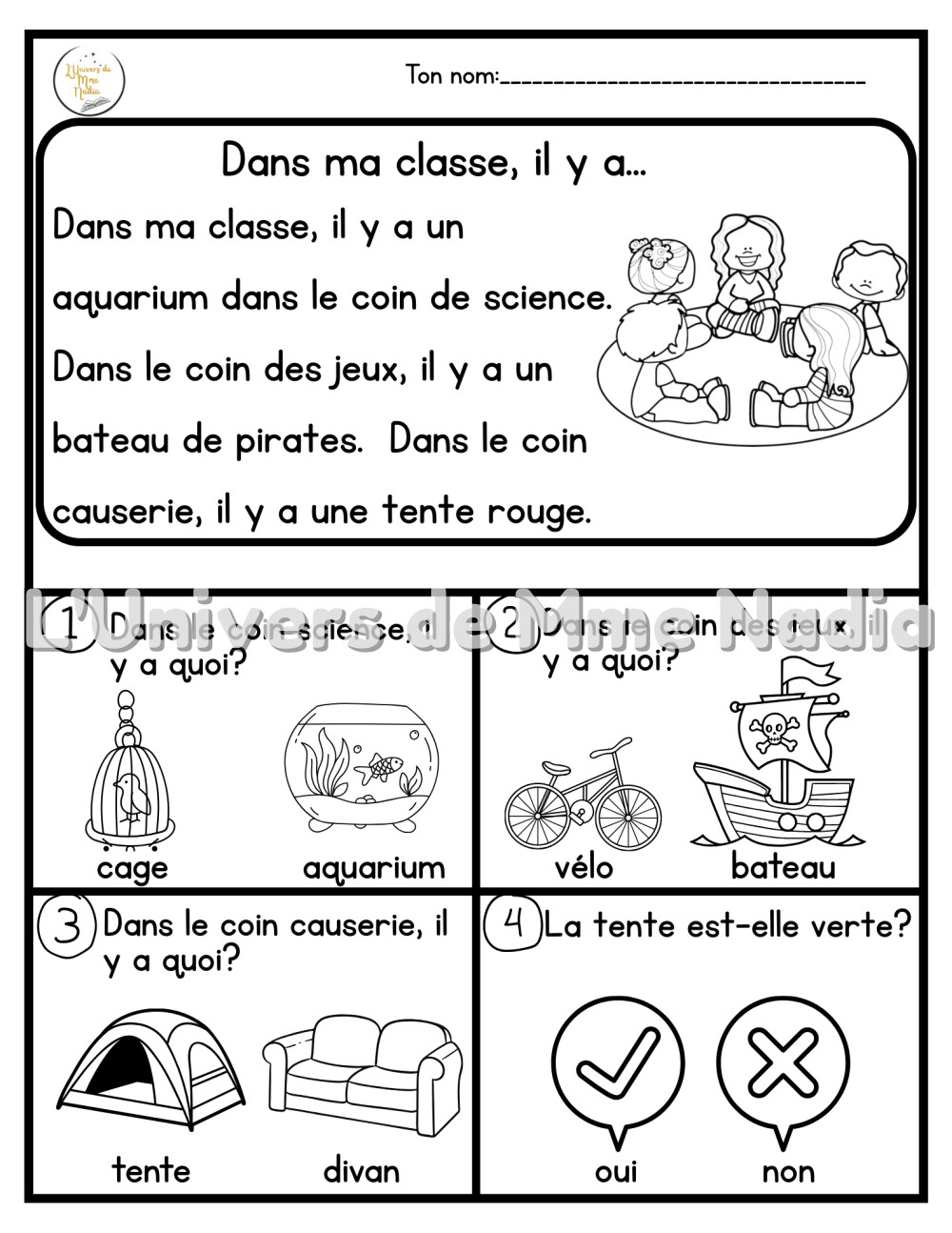 • En maternelle, l’enseignant lit la petite histoire, puis pose 4 questions de compréhension.