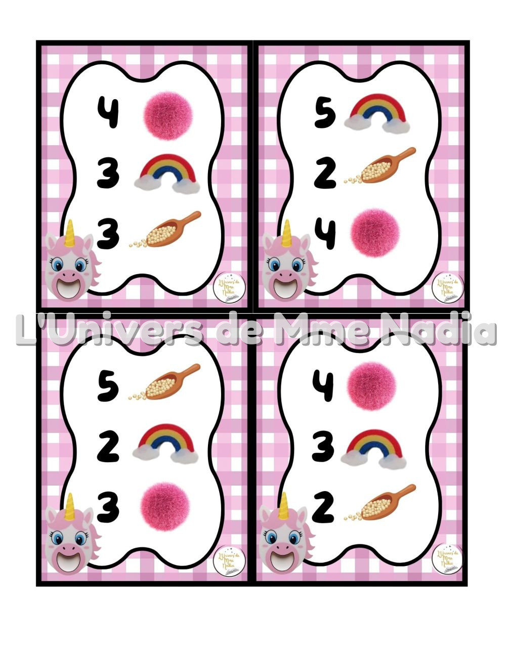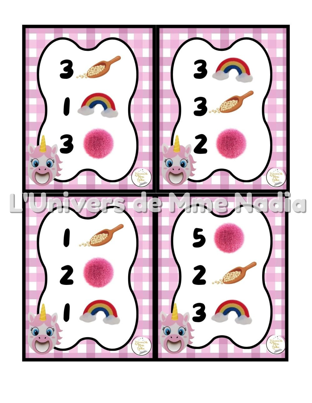 Angélicorne a faim est un jeu complémentaire au plateau J'ai faim, créé par Ébénisterie Steve Genesse. Le jeu comprend 32 petits menus conçus pour nourrir Angélicorne de façon ludique et éducative. Chaque carte propose un menu à réaliser avec différents éléments : • des arcs-en-ciel • des pompons roses, • et la possibilité d'ajouter des cuillères de mélange sensoriel. Les enfants sont invités à : • choisir le bon ingrédient, • mettre la bonne quantité, • et suivre les consignes du menu. Ce jeu permet de travailler les quantités, l'association, l'attention et la motricité fine, tout en ajoutant une dimension sensorielle et amusante. Avec ses 32 cartes toutes différentes, Angélicorne a faim offre une belle variété de défis pour enrichir l'utilisation du plateau J'ai faim.