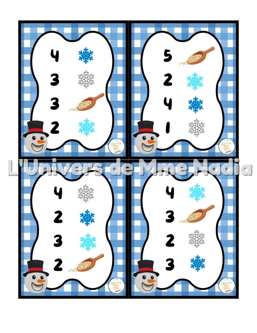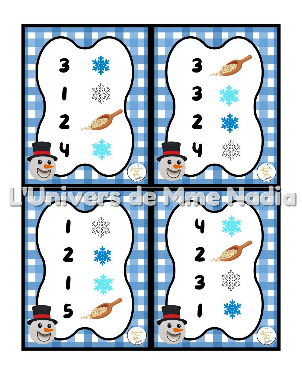 Bonhomme de neige a faim est un jeu complémentaire au plateau J'ai faim, créé par Ébénisterie Steve Genesse. Le jeu comprend 32 petits menus conçus pour nourrir le bonhomme de neige de façon ludique et éducative. Chaque carte propose un menu à réaliser avec différents éléments : • des flocons de différentes couleurs, • des pompons blancs, • et la possibilité d'ajouter des cuillères de mélange sensoriel. Les enfants sont invités à : • choisir le bon ingrédient, • mettre la bonne quantité, • et suivre les consignes du menu. Ce jeu permet de travailler les quantités, l'association, l'attention et la motricité fine, tout en ajoutant une dimension sensorielle et amusante. Avec ses 32 cartes toutes différentes, Bonhomme de neige a faim offre une belle variété de défis pour enrichir l'utilisation du plateau J'ai faim.