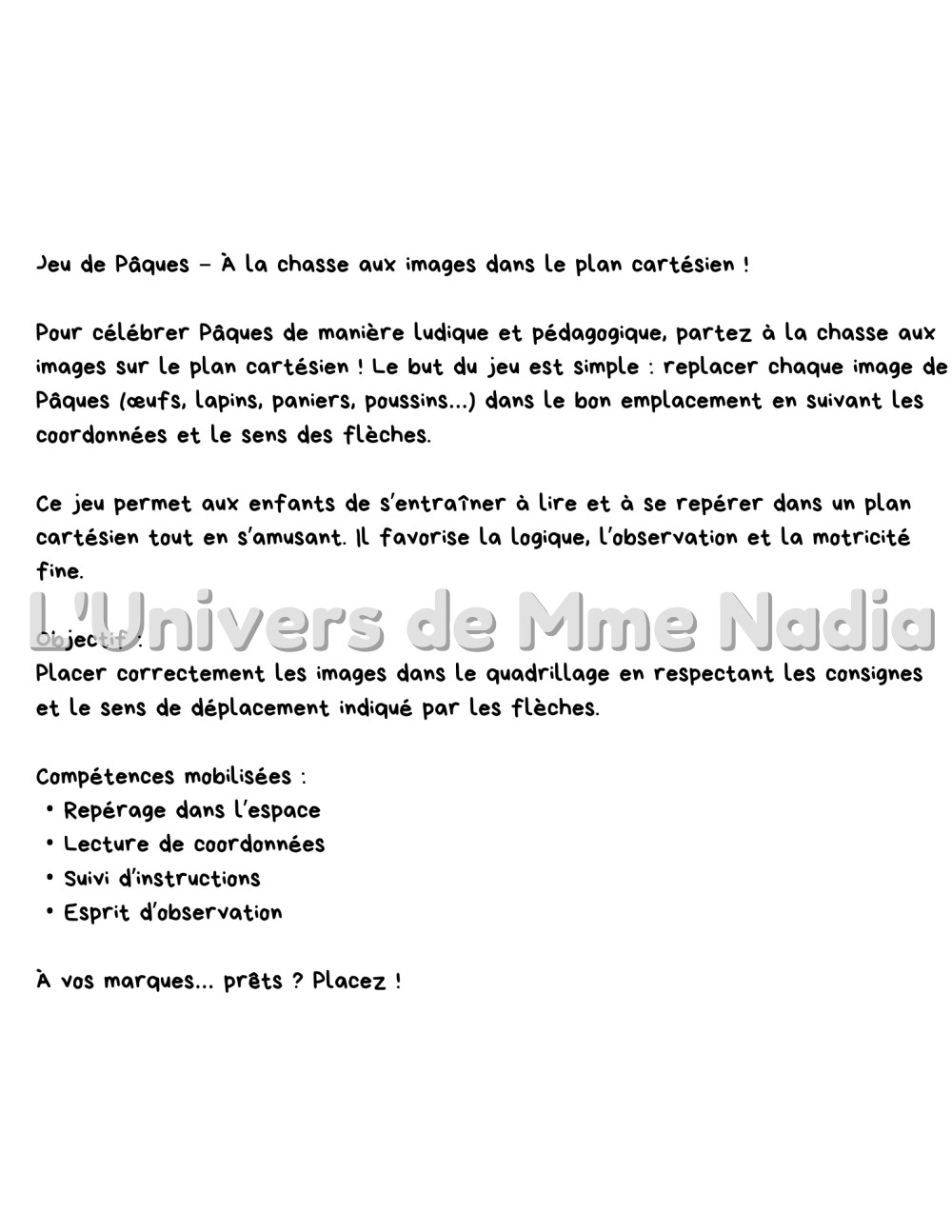 Pour célébrer Pâques de manière ludique et pédagogique, partez à la chasse aux images sur le plan cartésien ! Le but du jeu est simple : replacer chaque image de Pâques (œufs, lapins, paniers, poussins…) dans le bon emplacement en suivant les coordonnées et le sens des flèches. Ce jeu permet aux enfants de s’entraîner à lire et à se repérer dans un plan cartésien tout en s’amusant. Il favorise la logique, l’observation et la motricité fine.