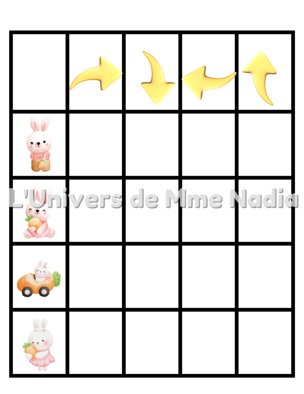 Placer correctement les images dans le quadrillage en respectant les consignes et le sens de déplacement indiqué par les flèches.