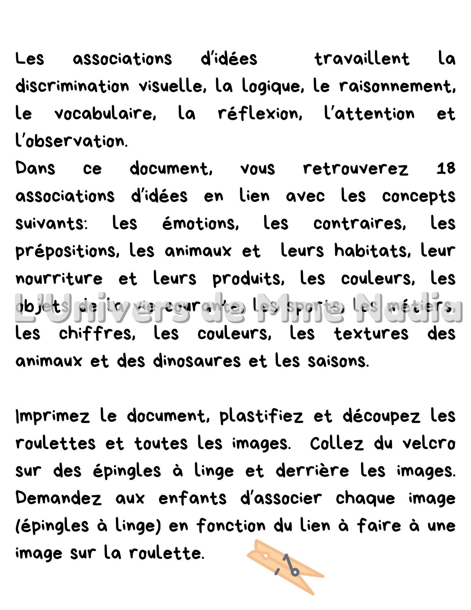 Dans ce document, vous retrouverez 18 associations d’idées en lien avec les concepts suivants: les émotions, les contraires, les prépositions, les animaux et leurs habitats, leur nourriture et leurs produits, les couleurs, les objets de la vie courante, les sports, les métiers, les chiffres, les couleurs, les textures des animaux et des dinosaures et les saisons.