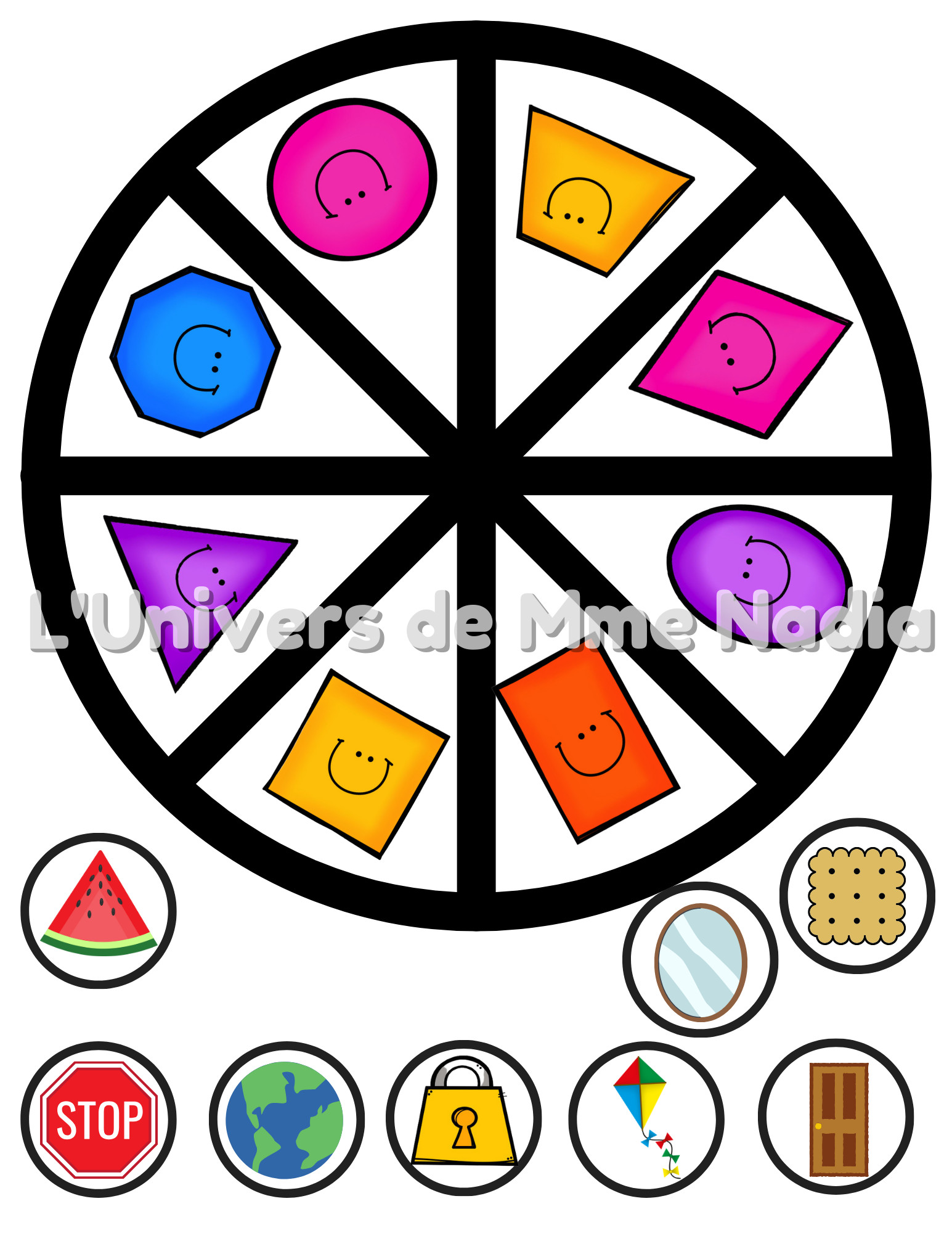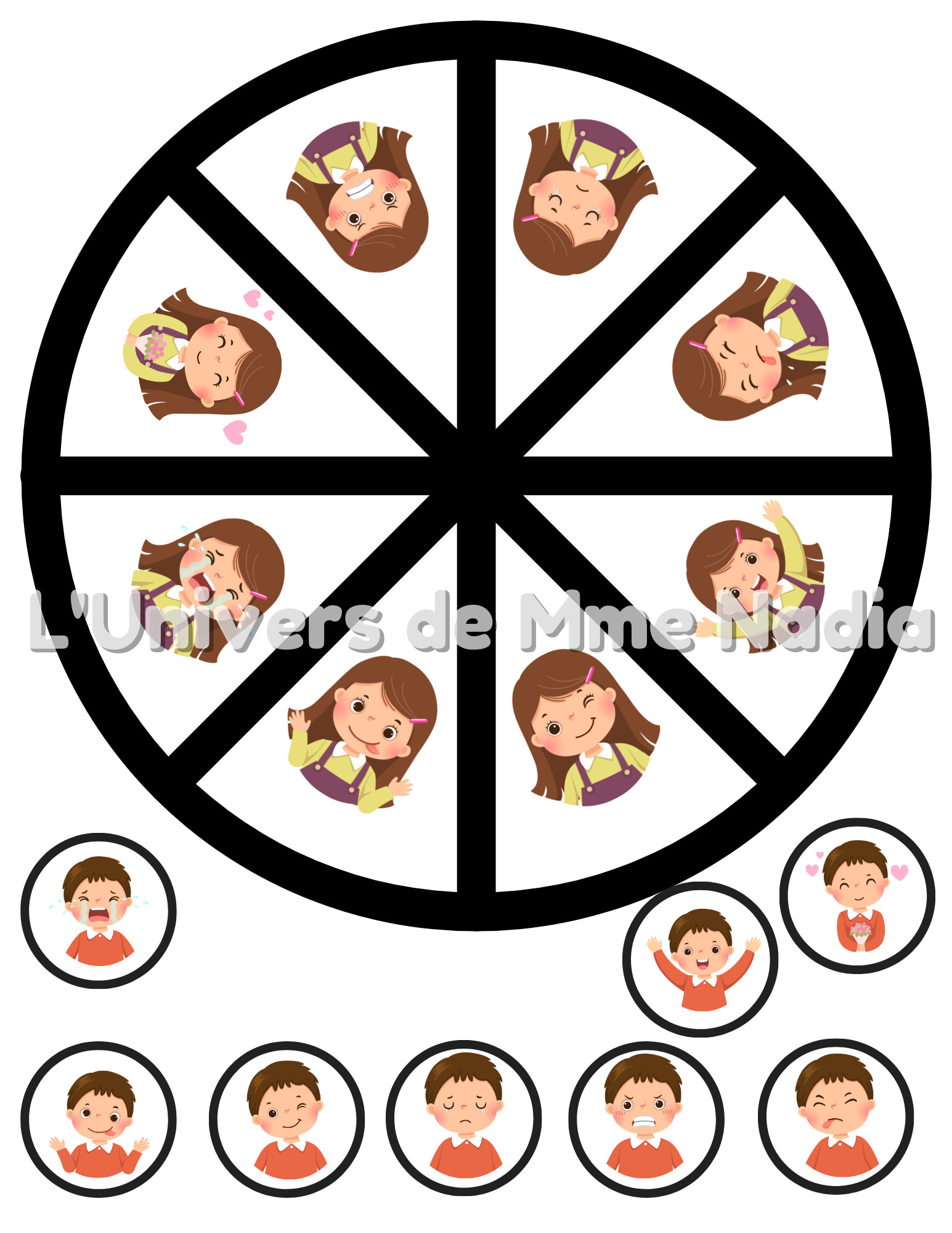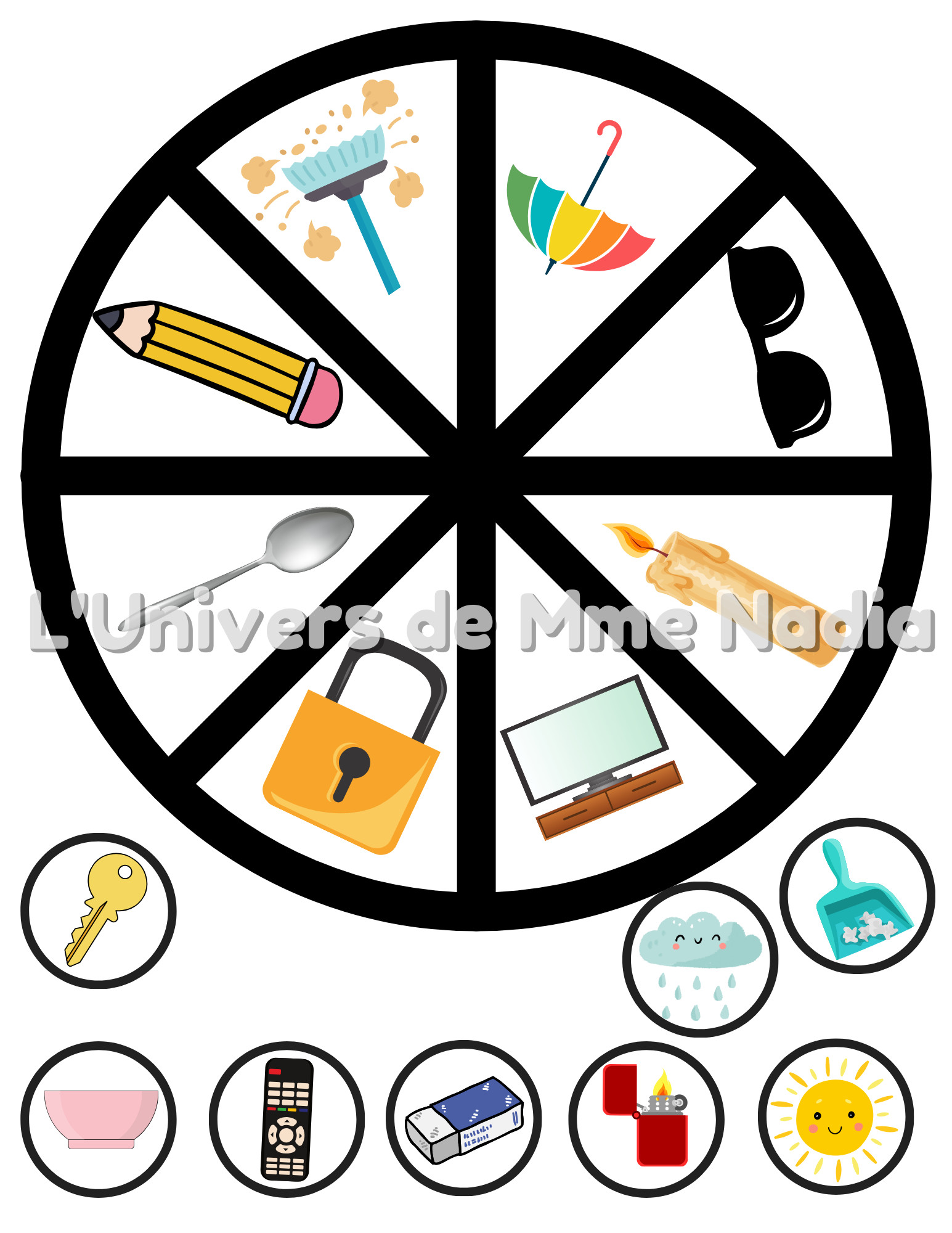 Imprimez le document, plastifiez et découpez les roulettes et toutes les images. Collez du velcro sur des épingles à linge et derrière les images. Demandez aux enfants d’associer chaque image (épingles à linge) en fonction du lien à faire à une image sur la roulette.