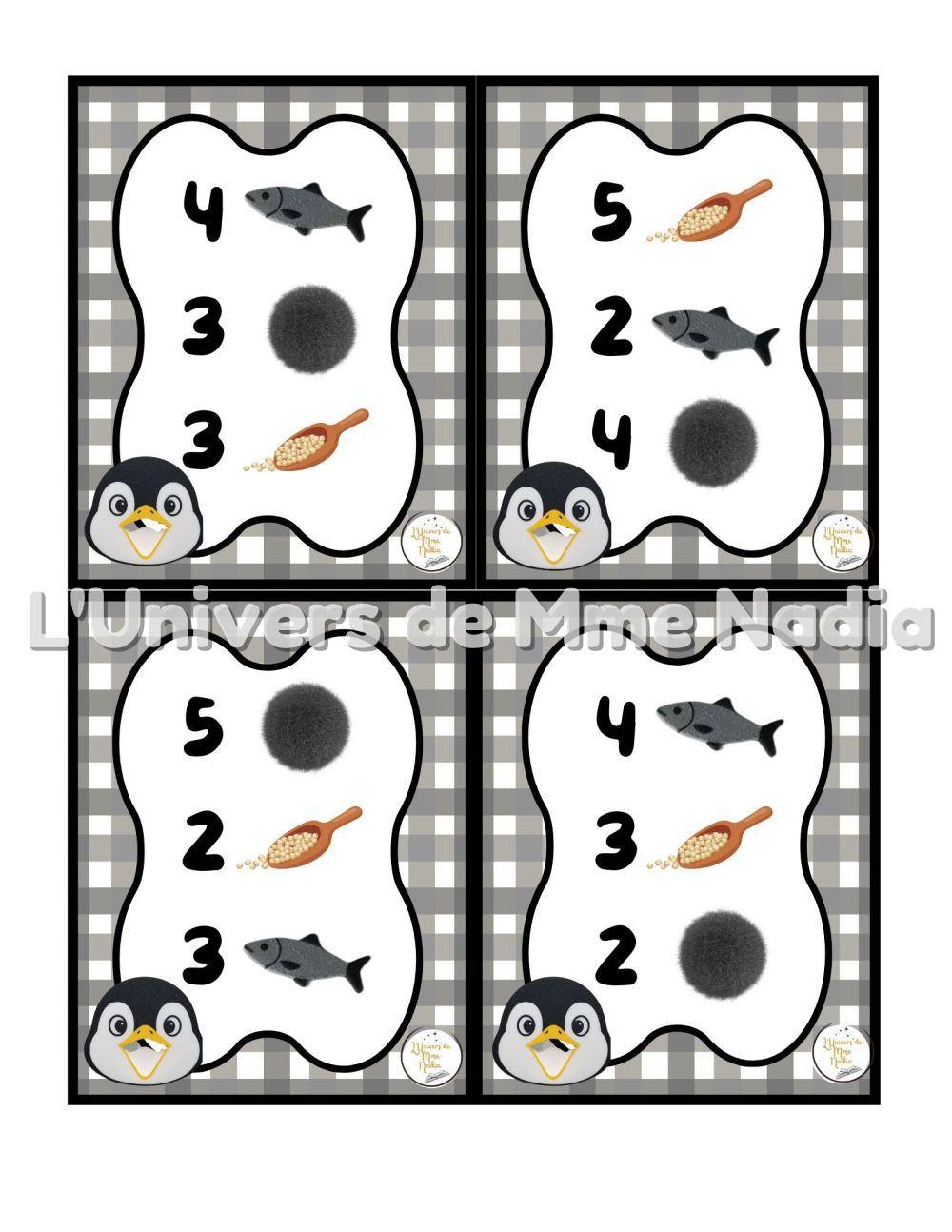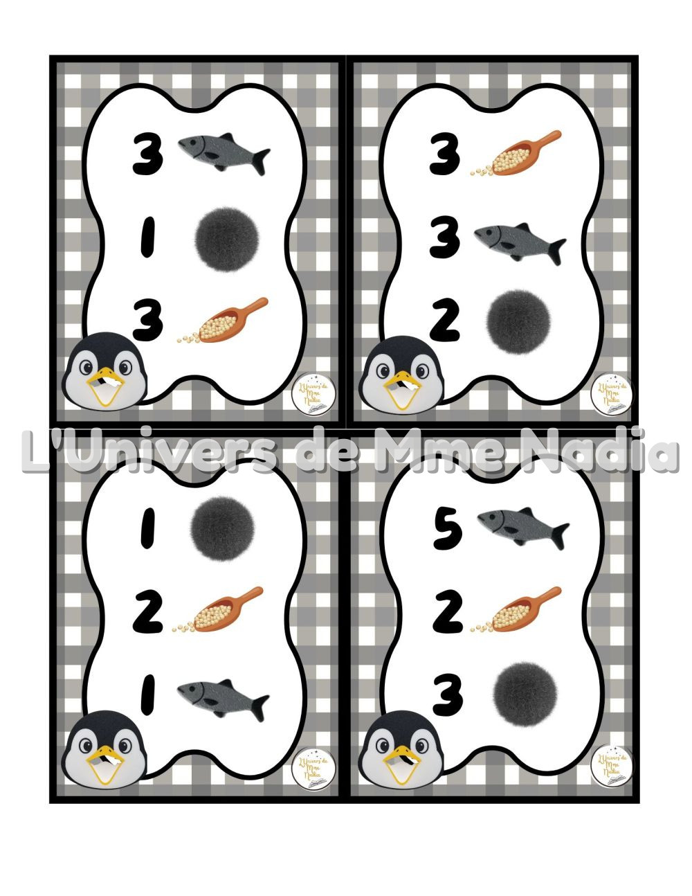 Pingouin a faim est un jeu complémentaire au plateau J'ai faim, créé par Ébénisterie Steve Genesse. Le jeu comprend 32 petits menus conçus pour nourrir le pingouin de façon ludique et éducative. Chaque carte propose un menu à réaliser avec différents éléments : • des poissons, • des pompons, • et la possibilité d'ajouter des cuillères de mélange sensoriel. Les enfants sont invités à : • choisir le bon ingrédient, • mettre la bonne quantité, • et suivre les consignes du menu. Ce jeu permet de travailler les quantités, l'association, l'attention et la motricité fine, tout en ajoutant une dimension sensorielle et amusante. Avec ses 32 cartes toutes différentes, Pingouin a faim offre une belle variété de défis pour enrichir l'utilisation du plateau J'ai faim.