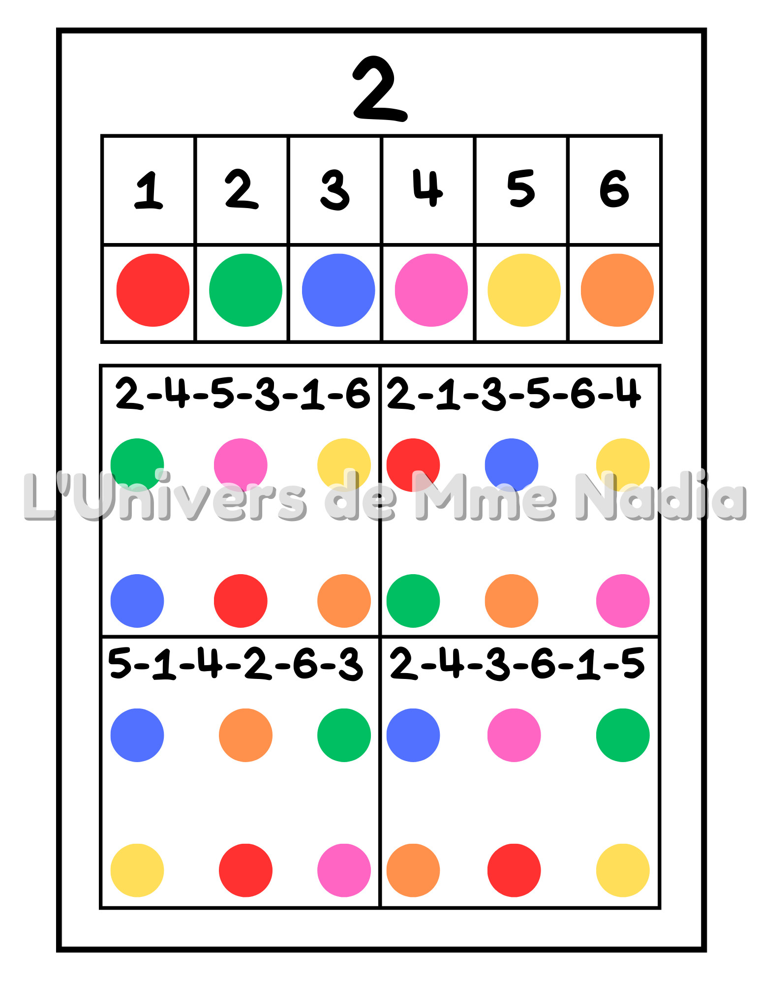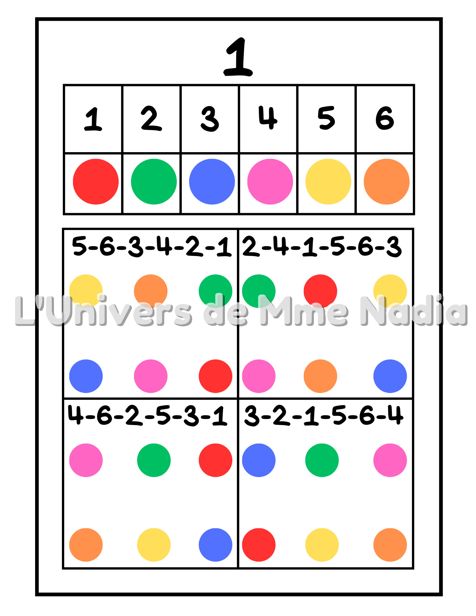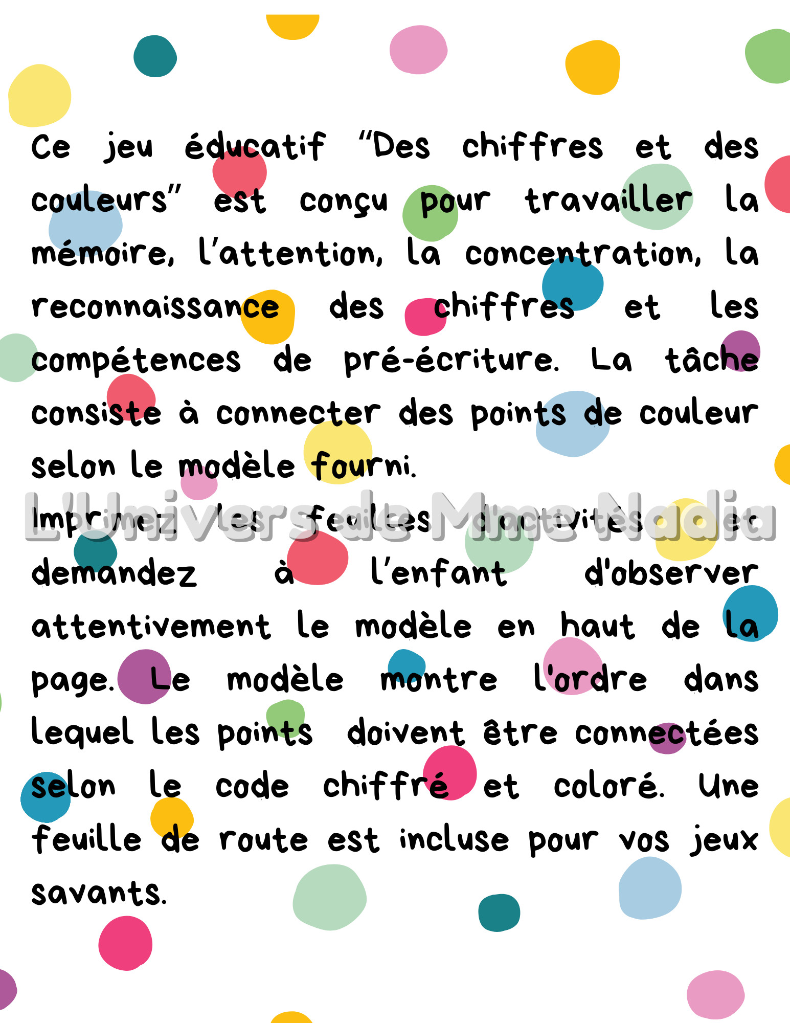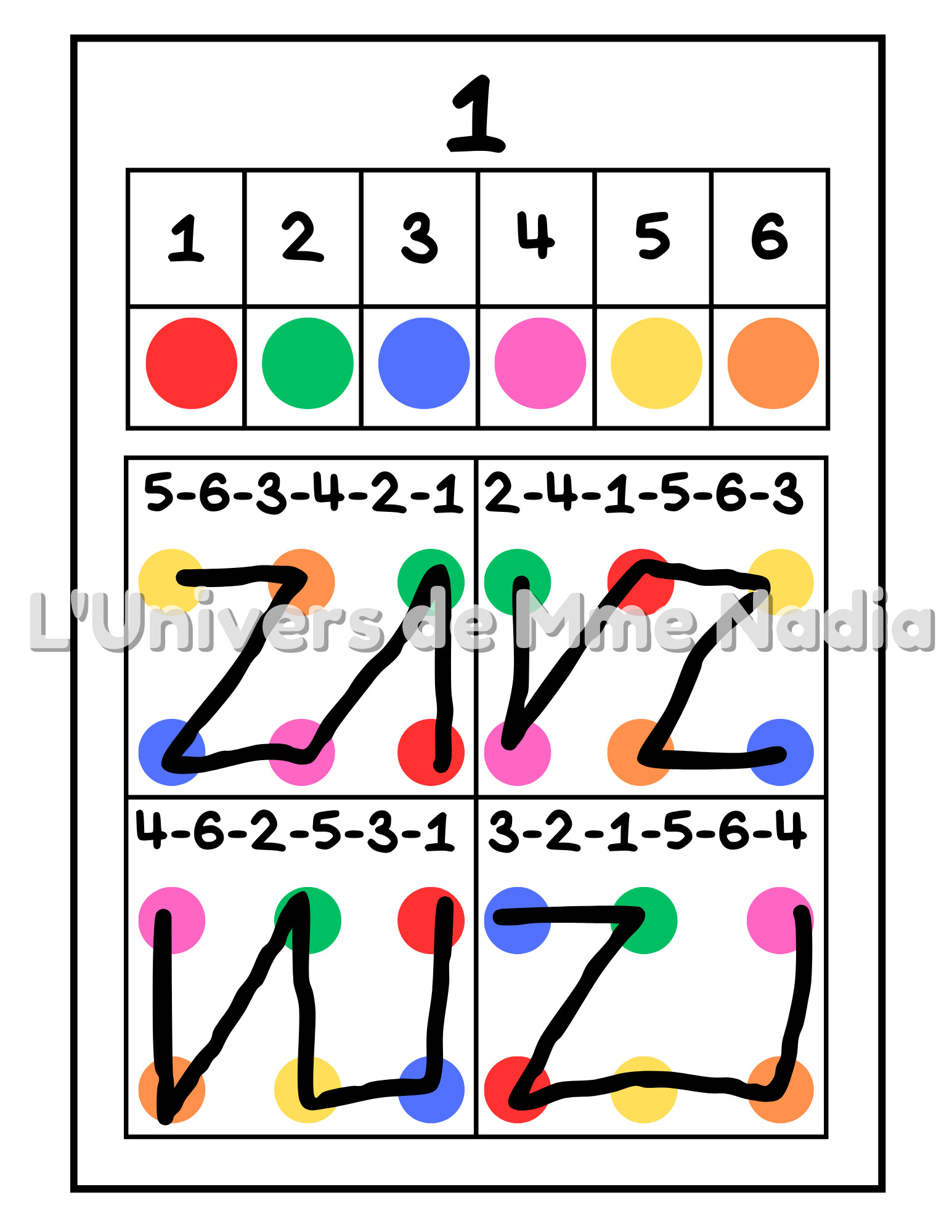 Le jeu éducatif “Des chiffres et des couleurs” est conçu pour travailler la mémoire, l’attention, la concentration, la reconnaissance des chiffres et les compétences de pré-écriture. La tâche consiste à connecter des points de couleur selon le modèle fourni. Imprimez les feuilles d'activités et demandez à l’enfant d'observer attentivement le modèle en haut de la page. Le modèle montre l'ordre dans lequel les points doivent être connectées selon le code chiffré et coloré. Une feuille de route est incluse pour vos jeux savants.