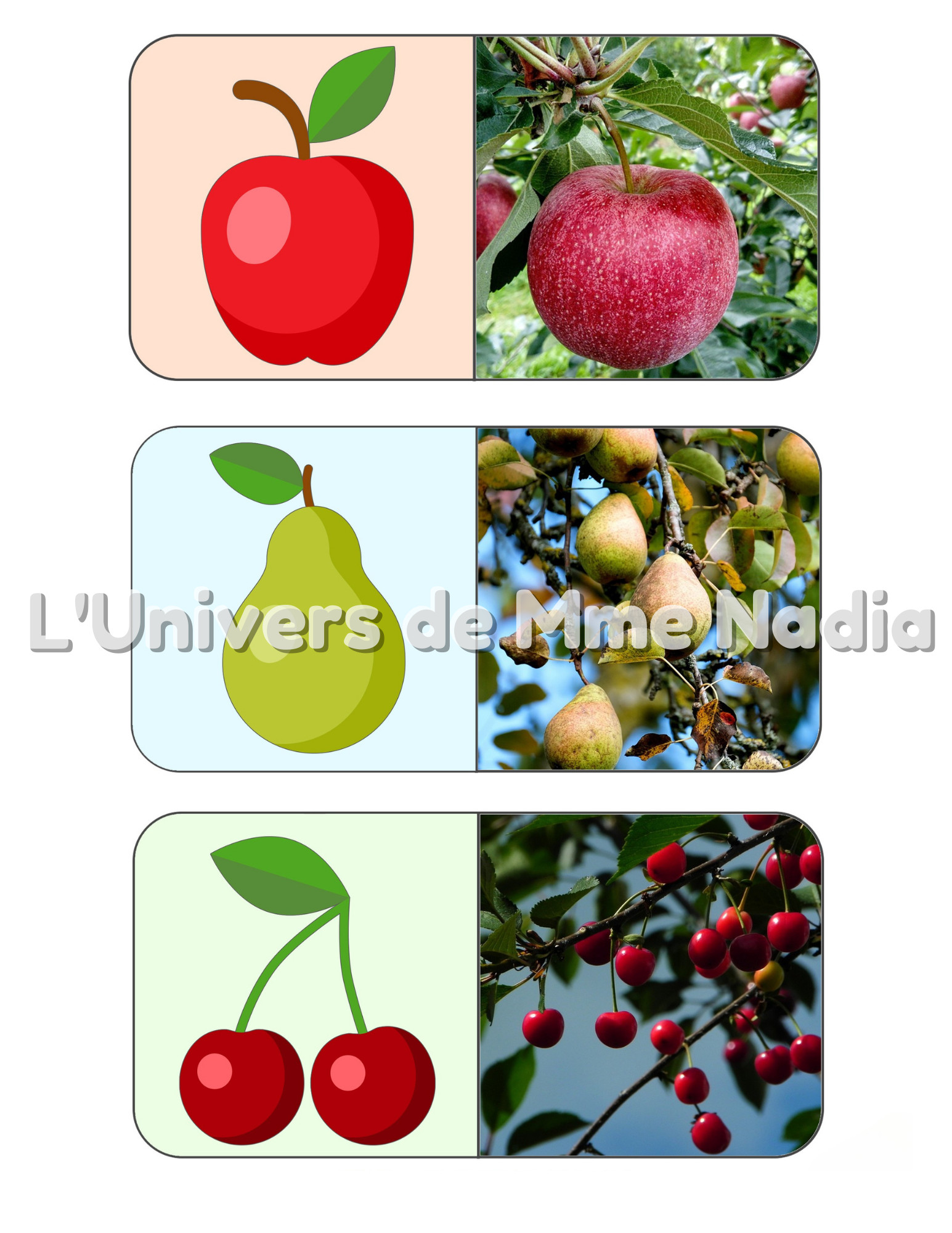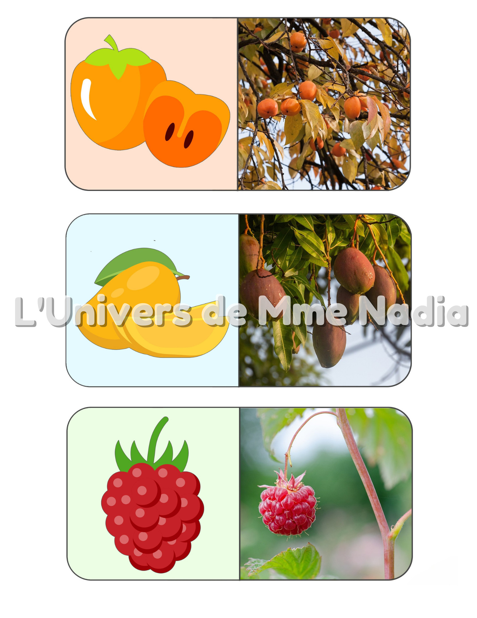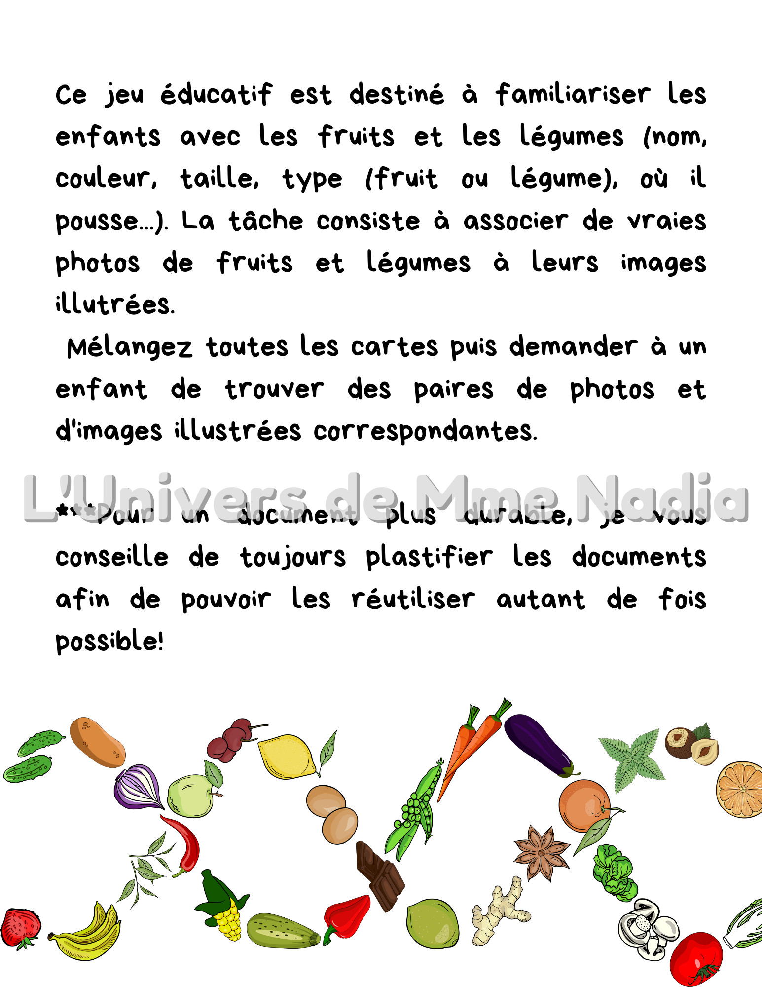 Ce jeu éducatif est destiné à familiariser les enfants avec les fruits et les légumes (nom, couleur, taille, type (fruit ou légume), où il pousse...). La tâche consiste à associer de 39 vraies photos de fruits et légumes à leurs images illustrées. Mélangez les 39 cartes puis demander à un enfant de trouver des paires de photos et d'images illustrées correspondantes. ***Pour un document plus durable, je vous conseille de toujours plastifier les documents afin de pouvoir les réutiliser autant de fois possible!