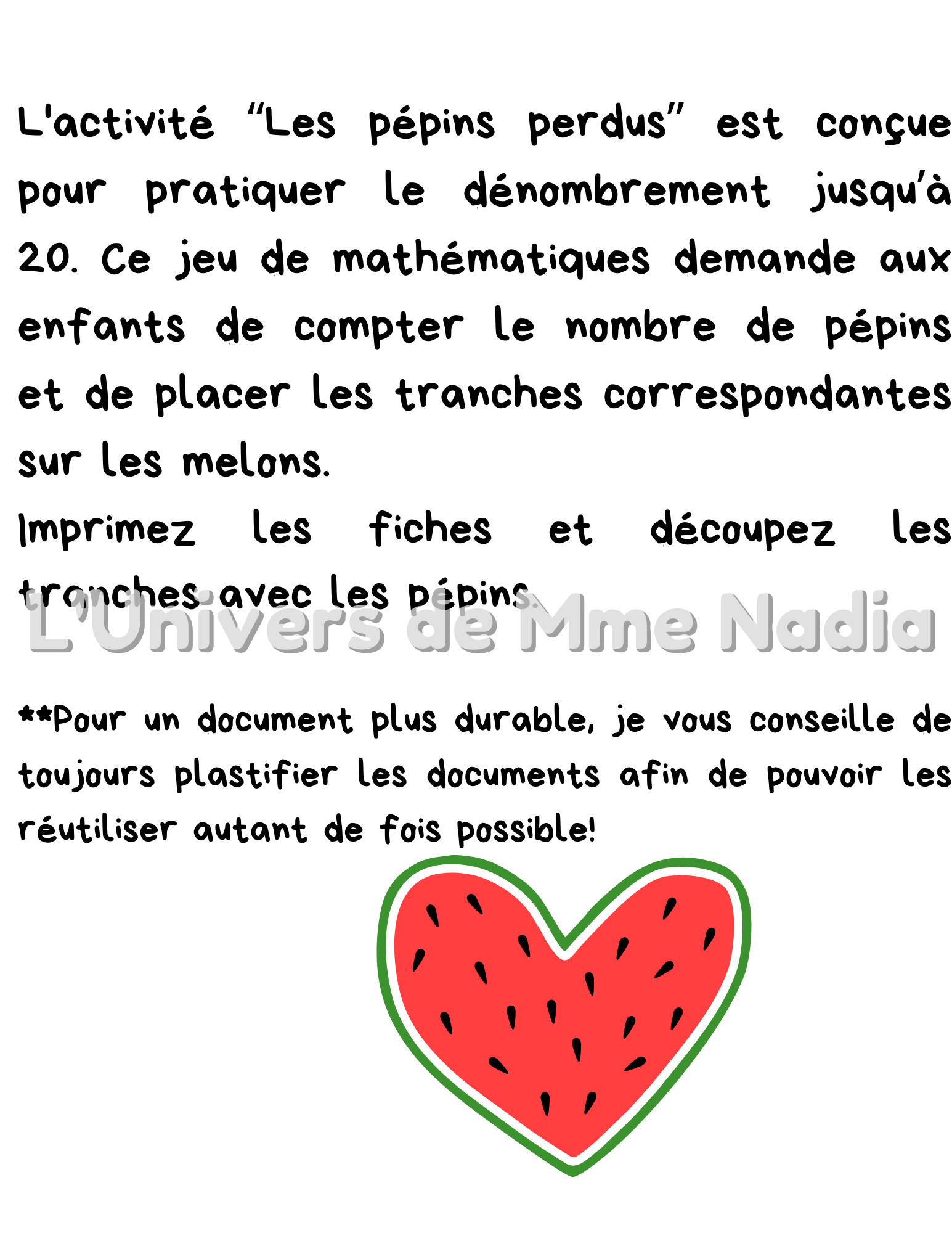 **Pour un document plus durable, je vous conseille de toujours plastifier les documents afin de pouvoir les réutiliser autant de fois possible!