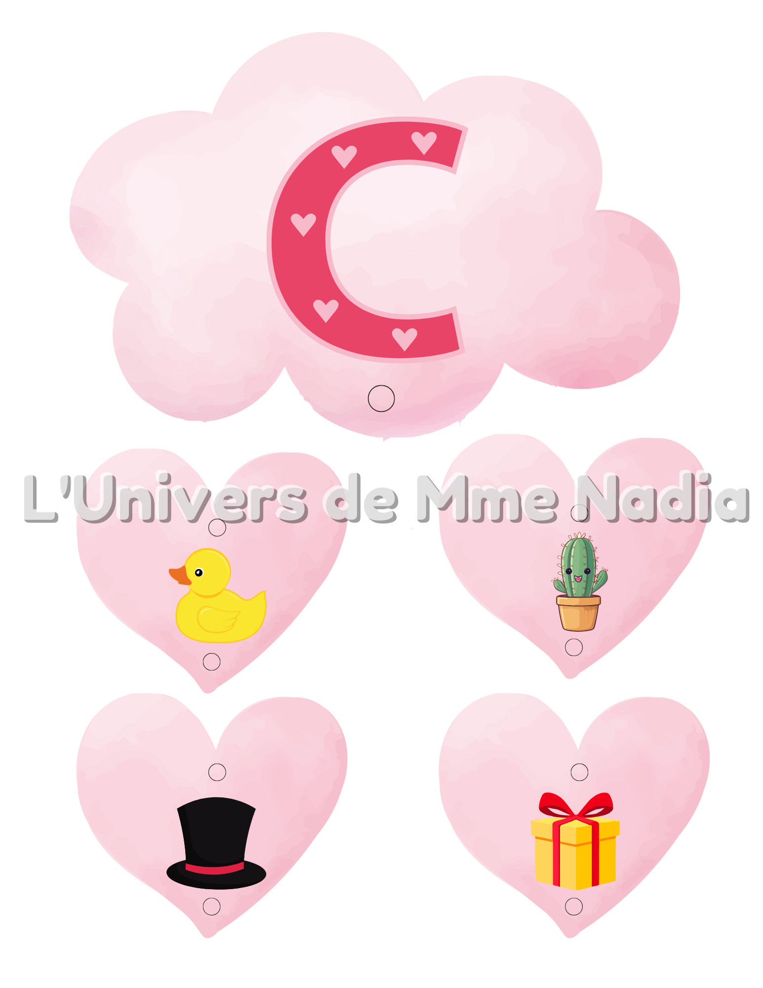 Une fois que vous aurez imprimé, plastifié ,découpé et poinçonné le document de 26 pages , l'élève devra, à l'aide de maillons, enchainer les coeurs- images au bon nuage.