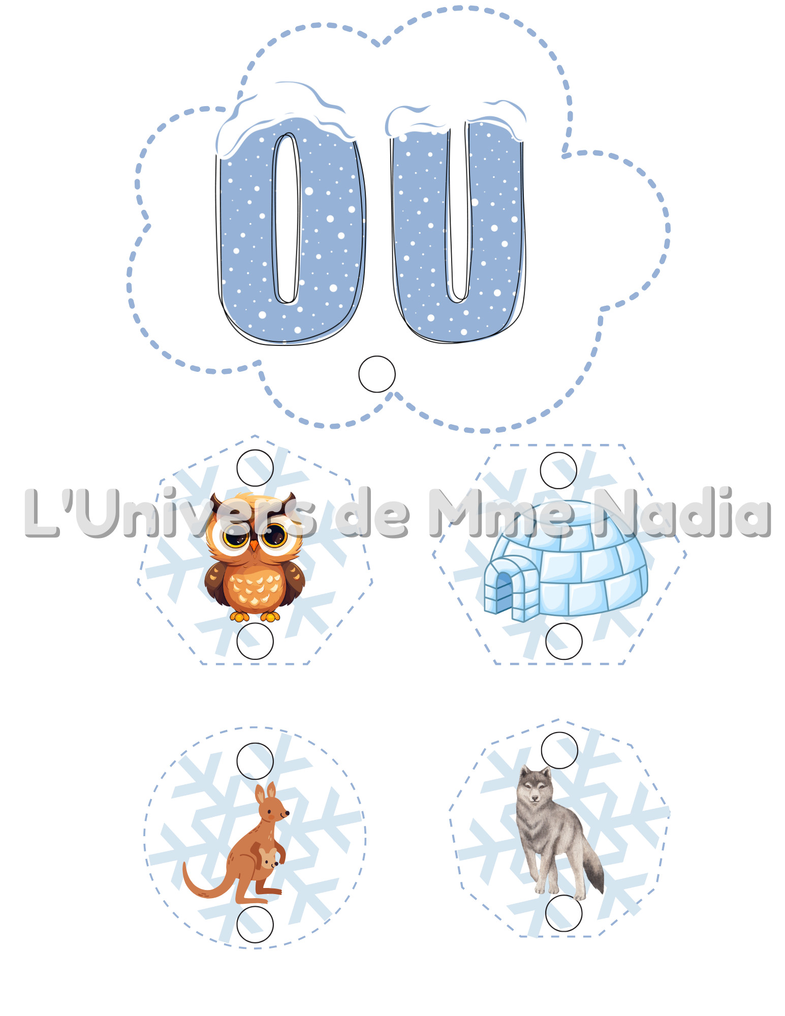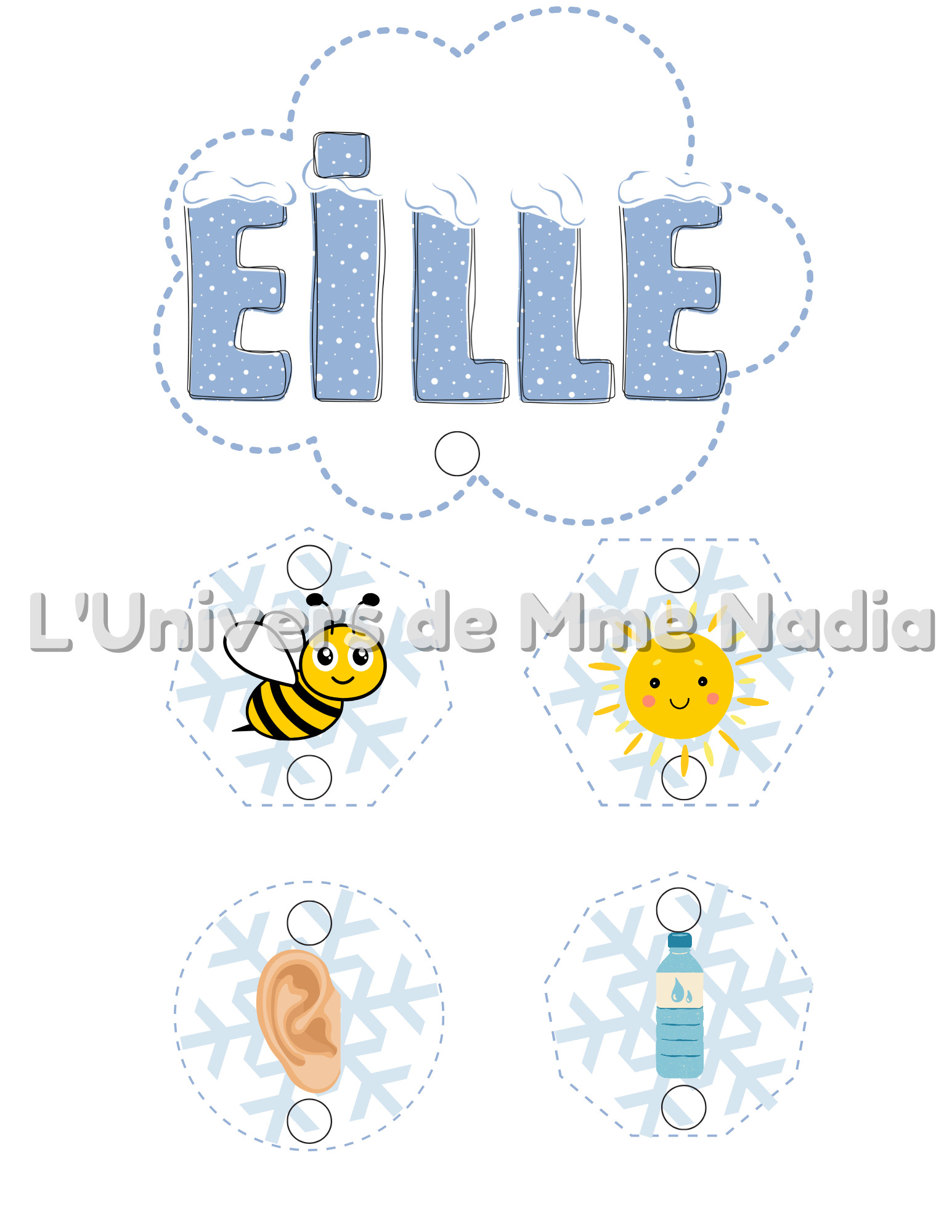 Une fois que vous aurez imprimé, plastifié ,découpé et poinçonné le document de 26 pages , l'élève devra, à l'aide de maillons, enchainer les flocons- images au bon nuage.