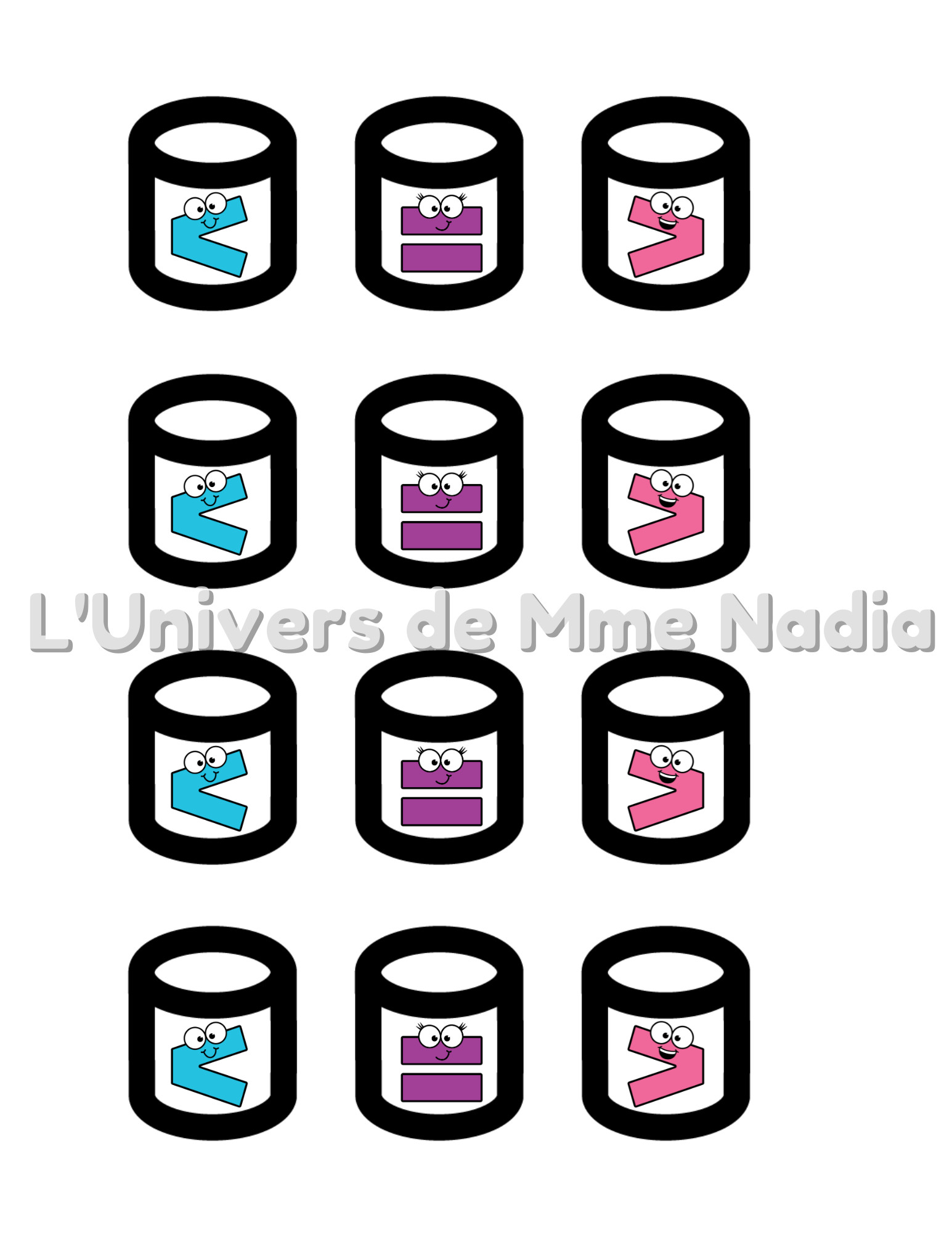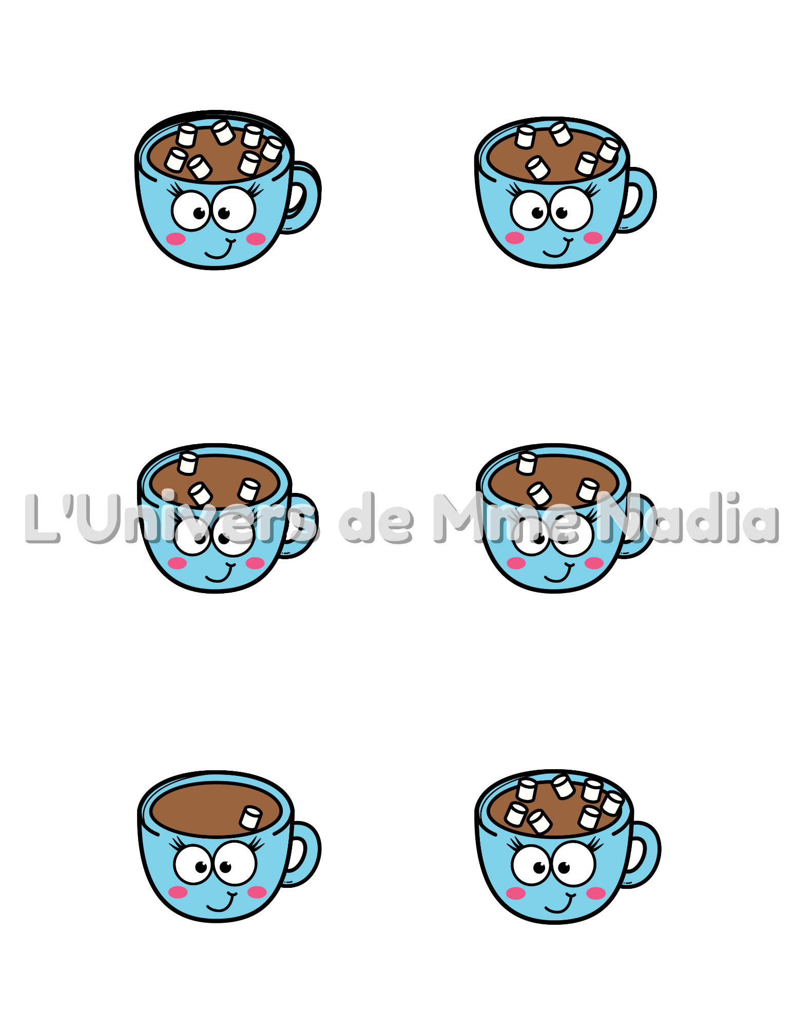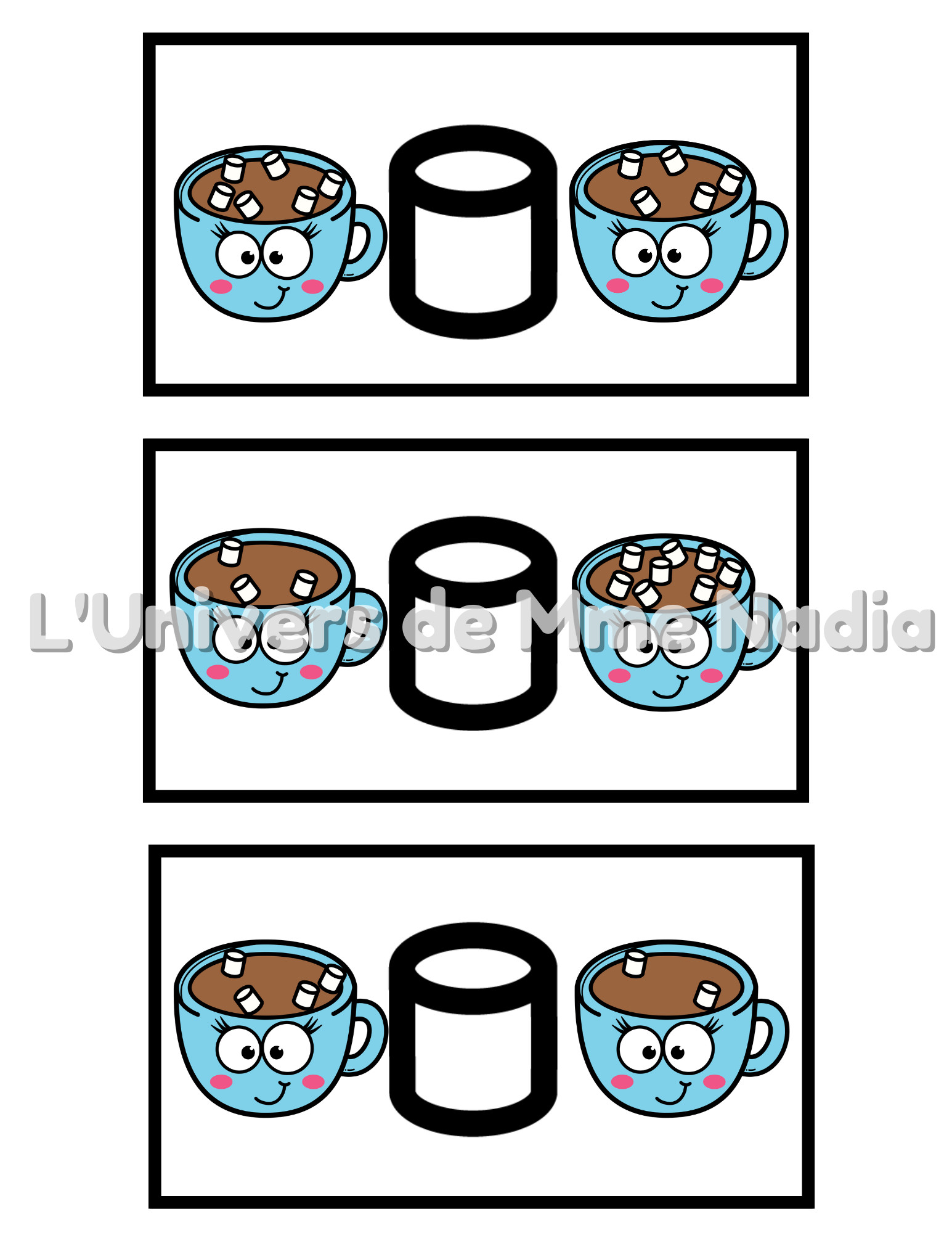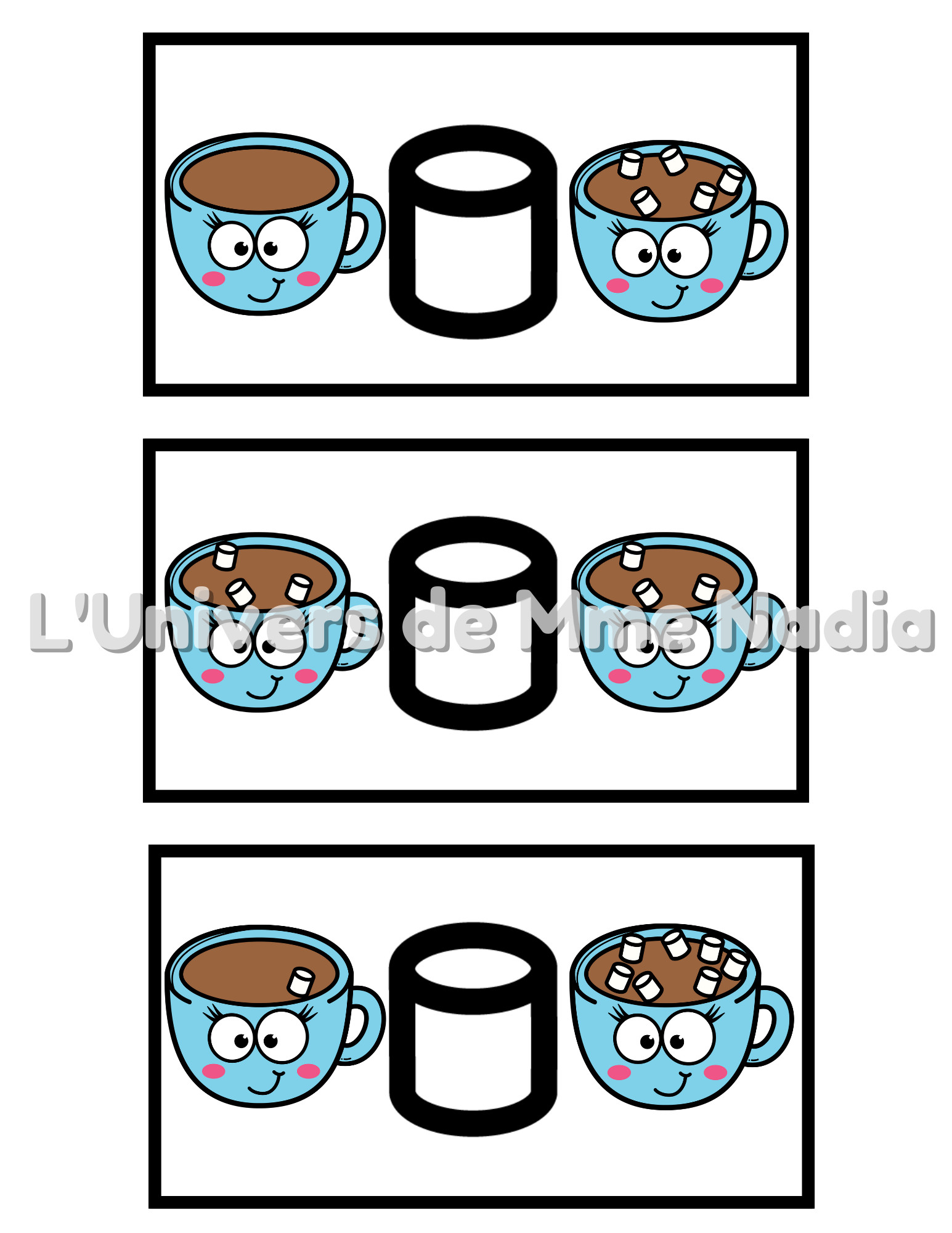 L'atelier consiste à apprendre à comparer des quantités (plus grand >, plus petit < ou égal =) jusqu'à 10 sur le thème des chocolats chauds.
