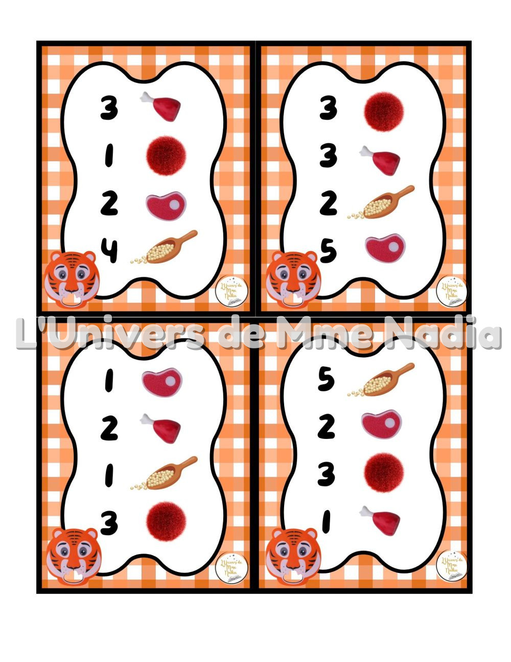 Le tigre a faim est un jeu complémentaire au plateau J'ai faim, créé par Ébénisterie Steve Genesse. Le jeu comprend 32 petits menus conçus pour nourrir le tigre de façon ludique et éducative. Chaque carte propose un menu à réaliser avec différents éléments : • deux sortes de viande • des pompons rouges, • et la possibilité d'ajouter des cuillères de mélange sensoriel. Les enfants sont invités à : • choisir le bon ingrédient, • mettre la bonne quantité, • et suivre les consignes du menu. Ce jeu permet de travailler les quantités, l'association, l'attention et la motricité fine, tout en ajoutant une dimension sensorielle et amusante. Avec ses 32 cartes toutes différentes, Le tigre a faim offre une belle variété de défis pour enrichir l'utilisation du plateau J'ai faim.