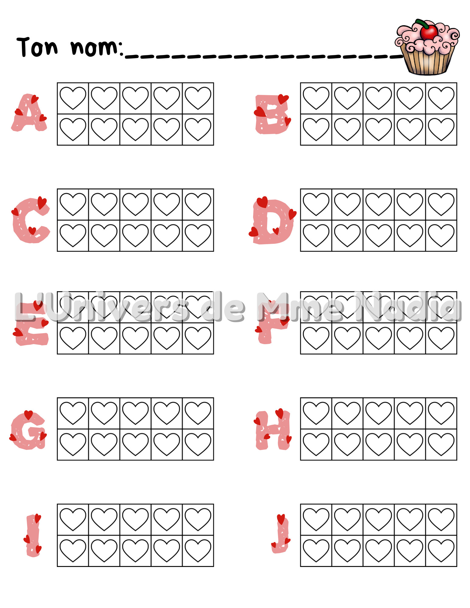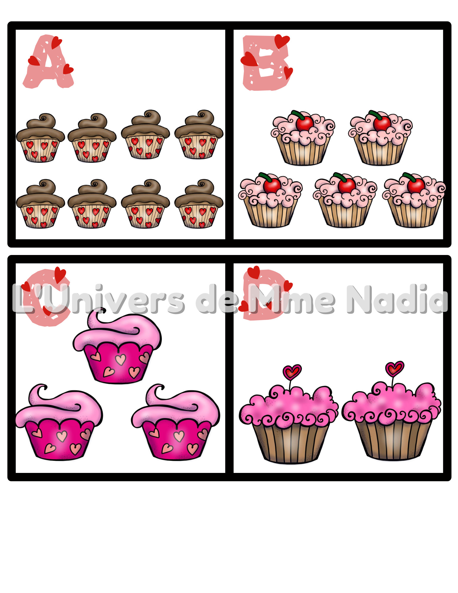 L'élève doit compter le nombre de cupcakes et colorier le bon nombre de coeurs dans la boite de 10.