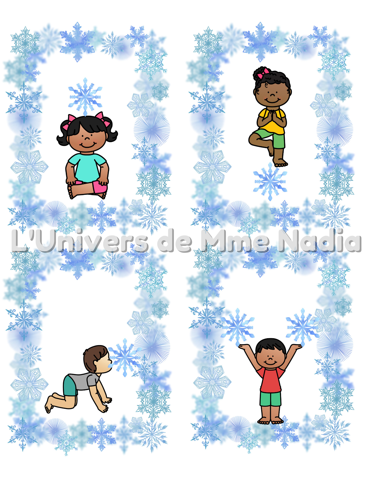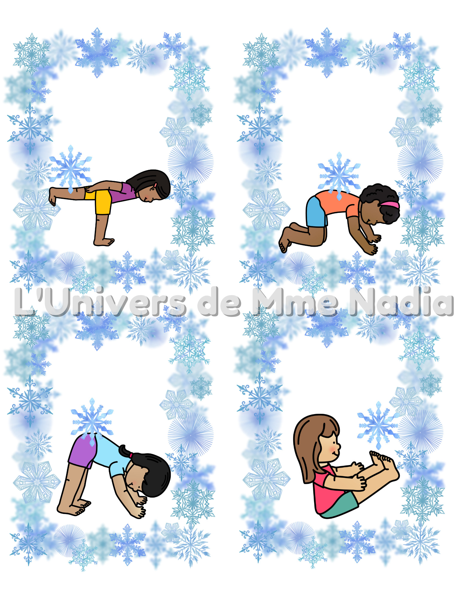Voici un document de 12 cartes de yoga à utiliser avec la thématique de l'hiver.