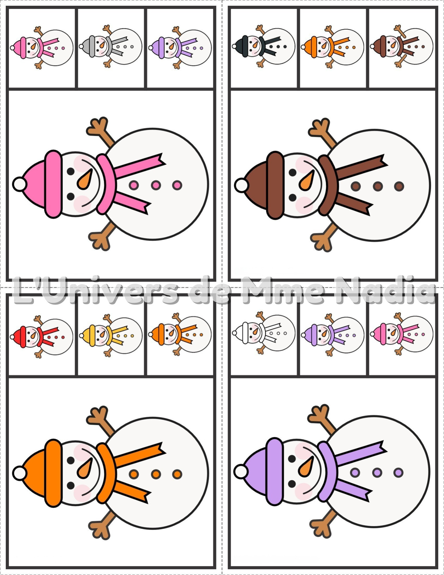 Voici une belle activité toute simple pour l'apprentissage des couleurs. L'élève doit associer la bonne couleur du bonhomme de neige avec celle du modèle. Vous pouvez demander de pincer avec une épingle à linge, un trombone ou d'encercler avec un crayon effaçable à sec.