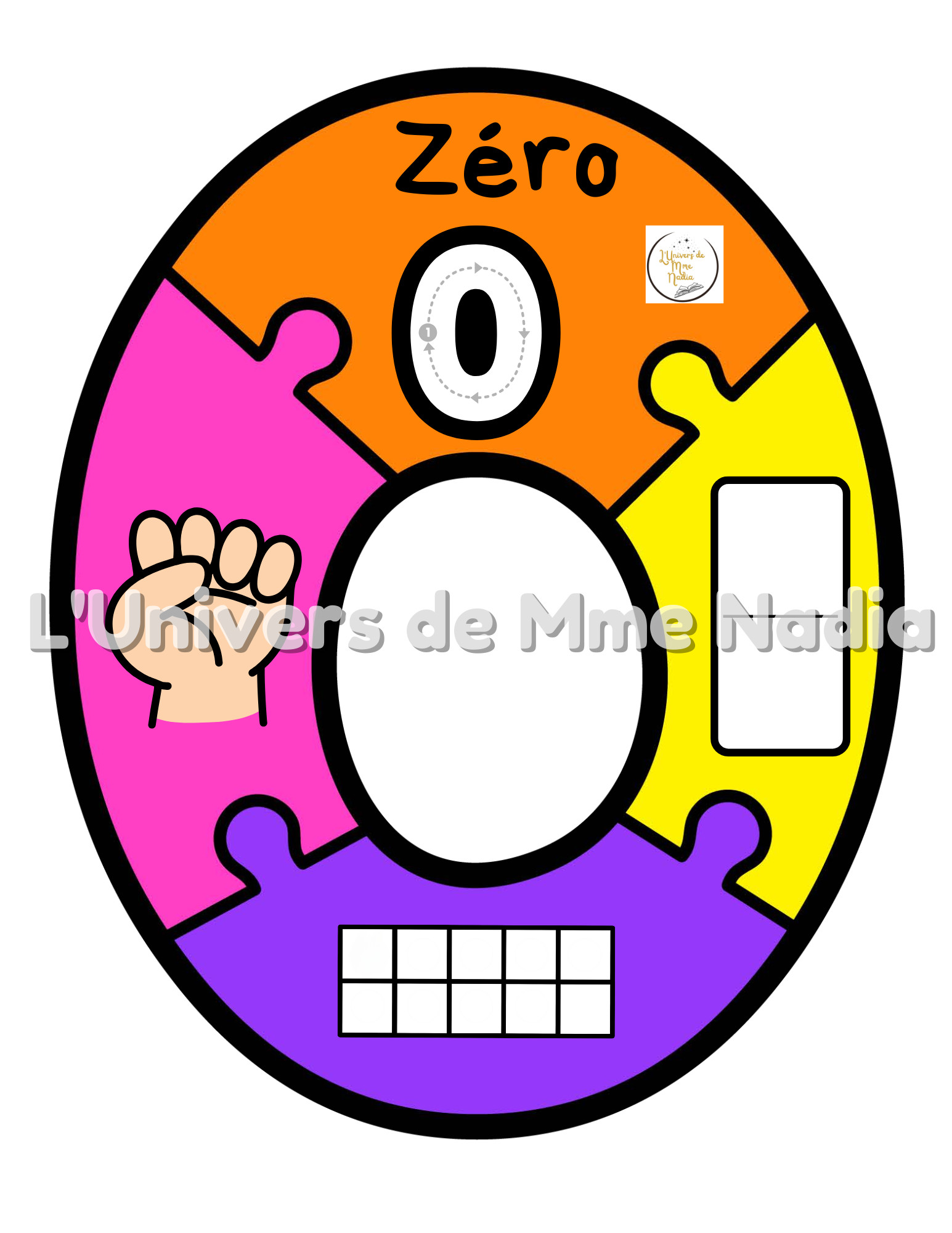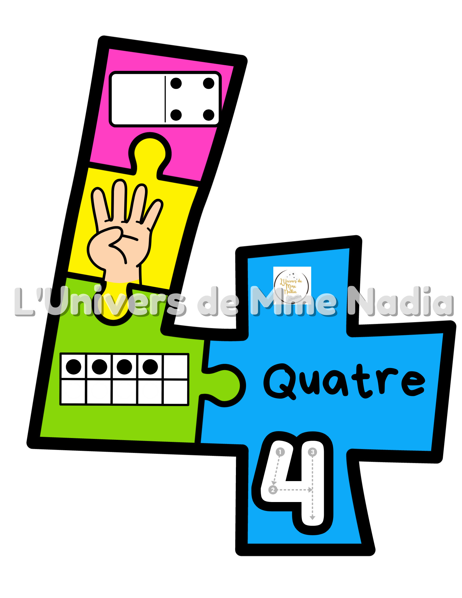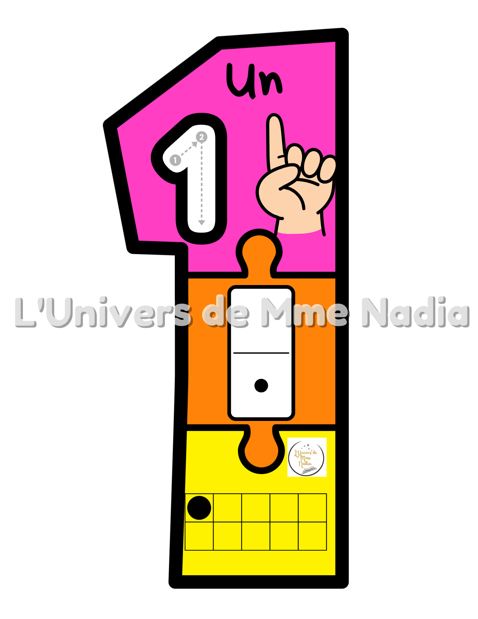 On y retrouve le chiffre sous forme de casse-tête ainsi que différentes représentations de celui-ci, le tracé, en lettres, sur les doigts, sur les dominos et dans des boites de 10.