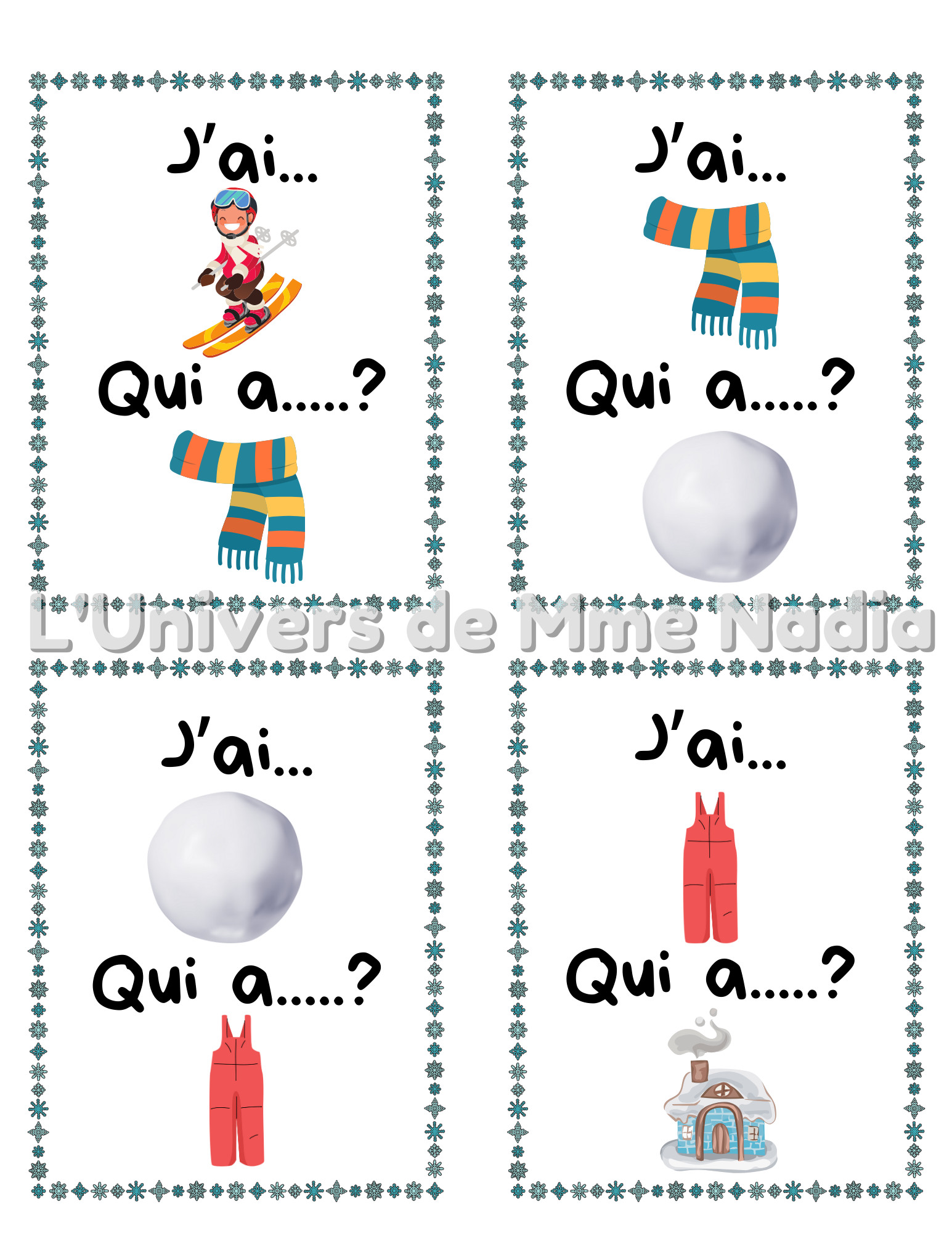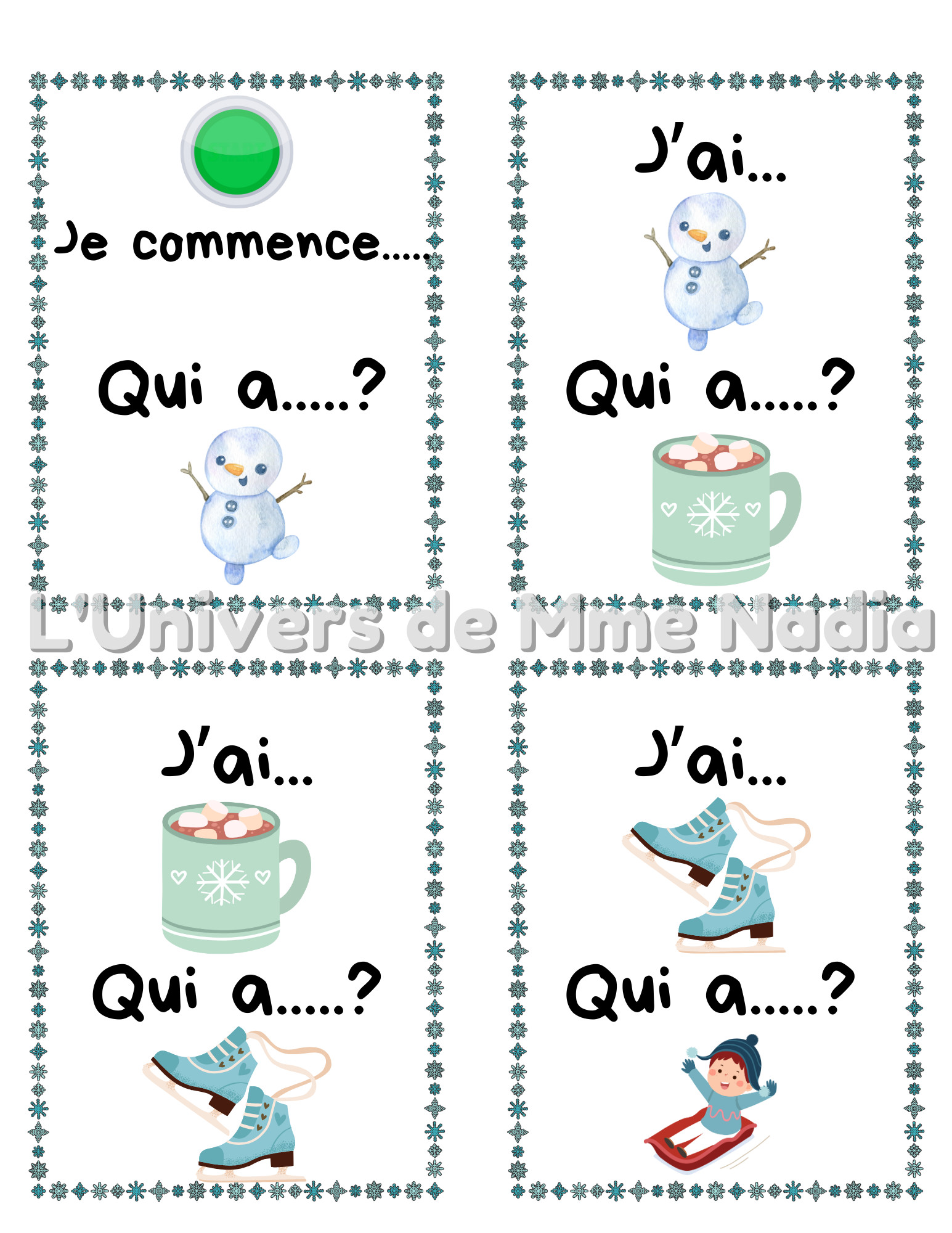 Chaque élève reçoit une carte ou deux. La première personne est celle qui à la carte "Je commence" avec un rond vert et dit: Qui a...(elle décrit son image) la deuxième personne est celle qui entend la description de son image. Elle dit : J'ai.....qui a.... Le jeu continue jusqu'à la dernière personne qui à la carte qui est écrit "Fin" avec un point rouge. Vous pouvez encourager les élèves à essayer de terminer le jeu de plus en plus rapidement.