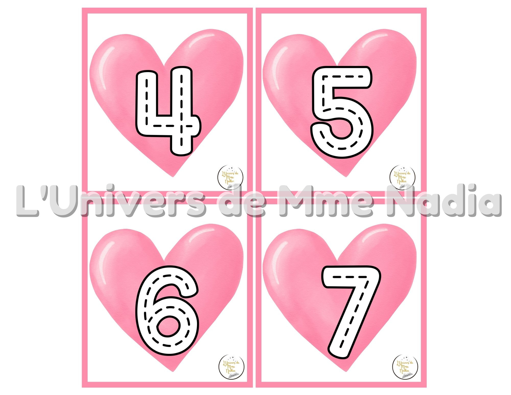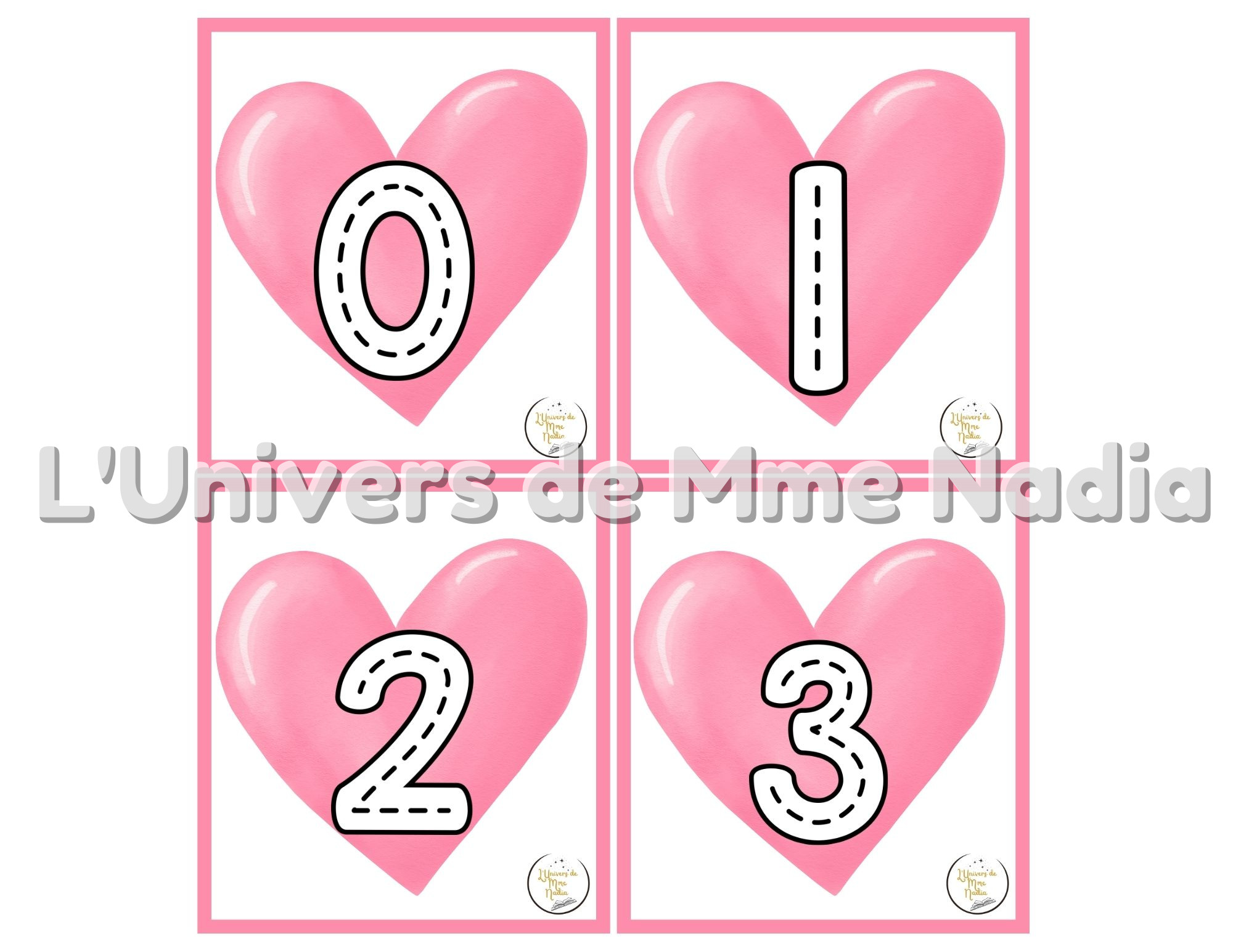 Ce document propose les nombres de 0 à 20 en modèles à tracer, avec un visuel attrayant de Saint-Valentin.