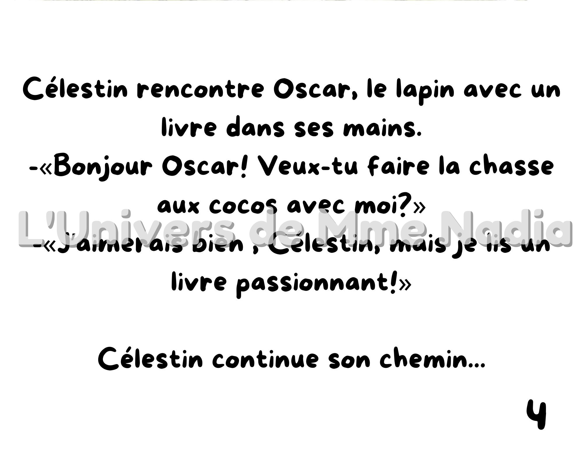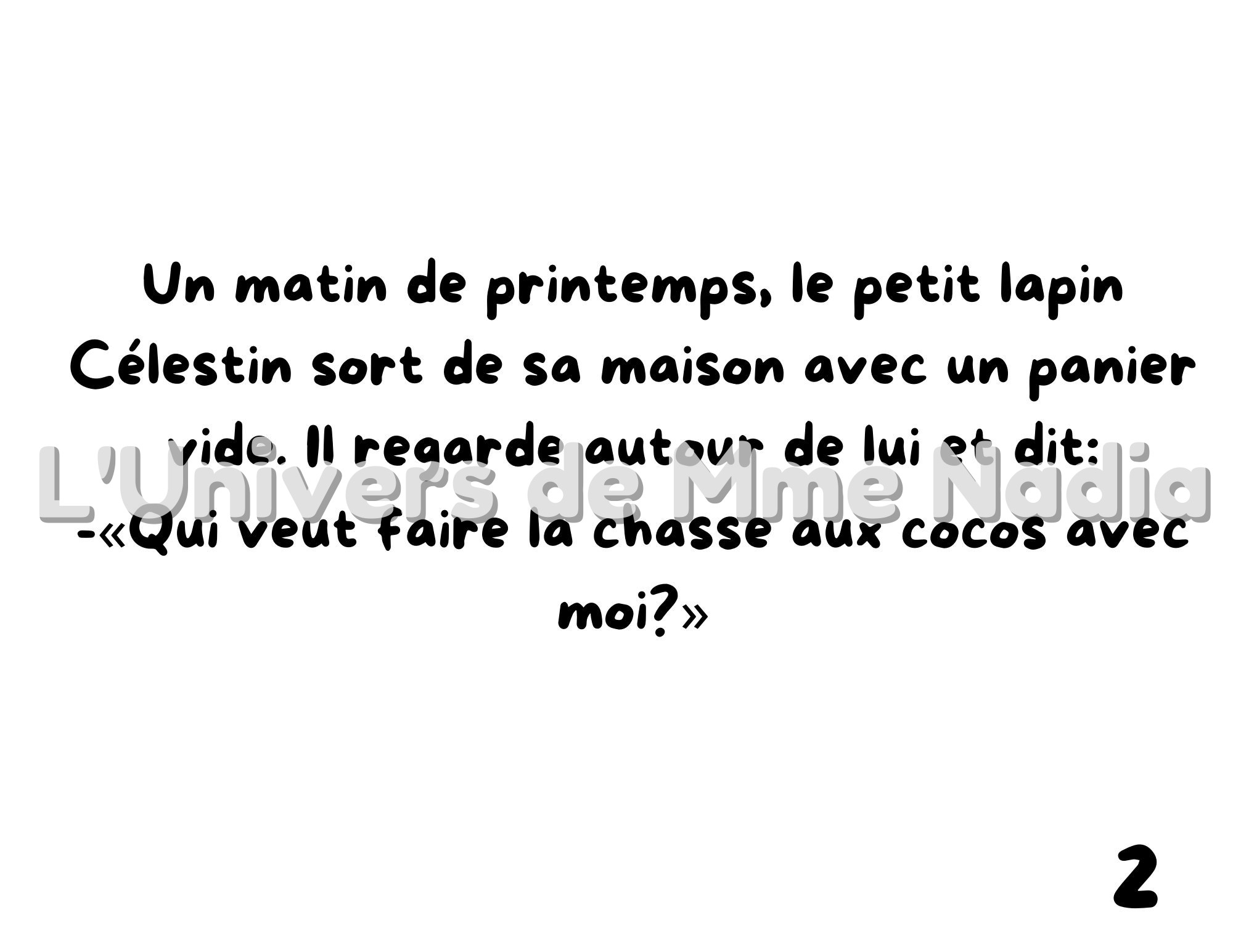 Kamishibaï – Qui veut faire la chasse aux cocos avec moi? Partez à la recherche avec Célestin le lapin qui cherche un ami pour faire la chasse aux cocos avec lui. Tous ses amis sont très occupés à jardiner, à jouer, à cuisiner...réussira-t-il à trouver quelqu'un?