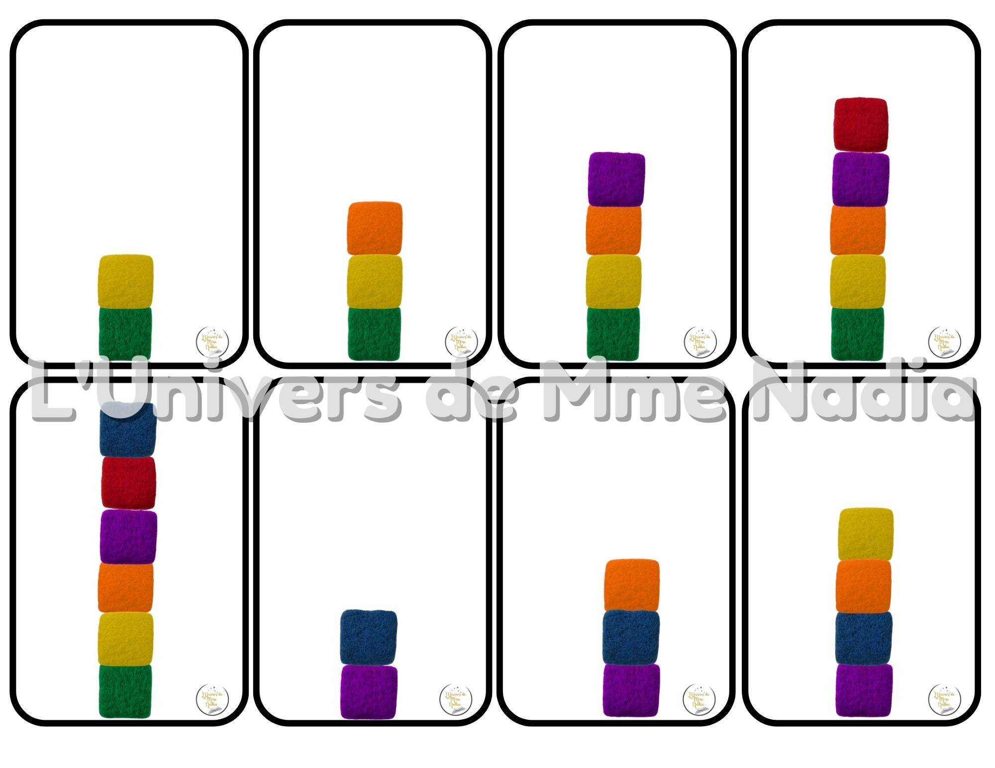 40 modèles de tours à reproduire, offrant une progression de 2 à 6 cubes pour travailler la motricité fine, la coordination œil-main, la logique (essais / erreurs) et la reconnaissance des couleurs.