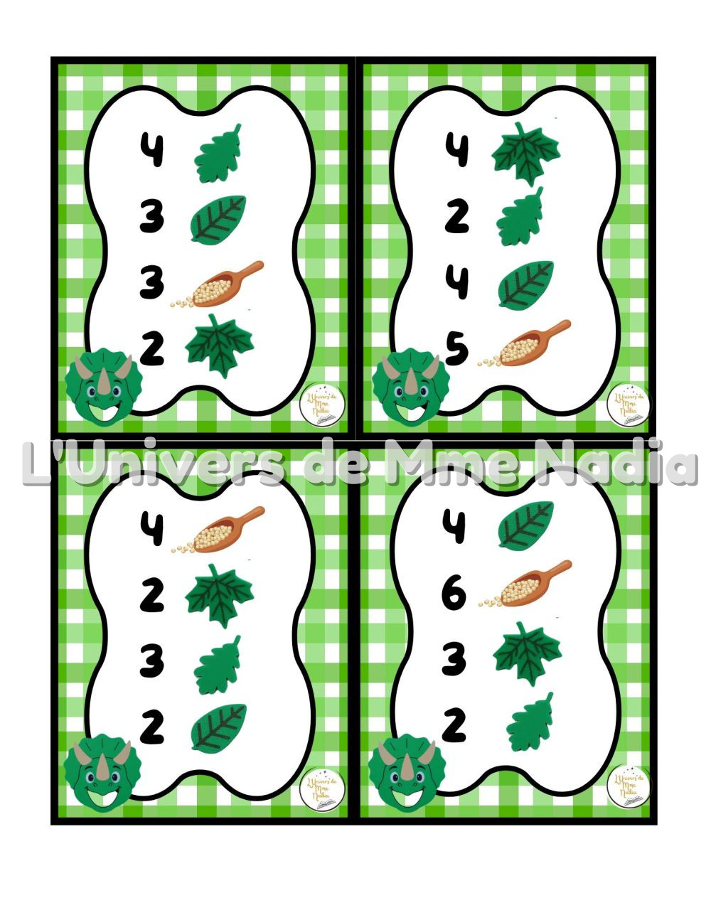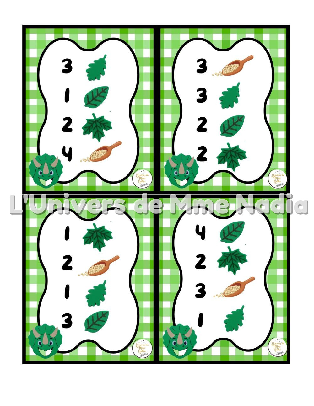 Le Tricératops a faim est un jeu complémentaire au plateau J'ai faim, créé par Ébénisterie Steve Genesse. Le jeu comprend 32 petits menus conçus pour nourrir le dinosaure de façon ludique et éducative. Chaque carte propose un menu à réaliser avec différents éléments : • trois sortes de feuilles • des pompons verts et la possibilité d'ajouter des cuillères de mélange sensoriel. Les enfants sont invités à : • choisir le bon ingrédient, • mettre la bonne quantité, • et suivre les consignes du menu. Ce jeu permet de travailler les quantités, l'association, l'attention et la motricité fine, tout en ajoutant une dimension sensorielle et amusante. Avec ses 32 cartes toutes différentes, La Tricératops a faim offre une belle variété de défis pour enrichir l'utilisation du plateau J'ai faim.