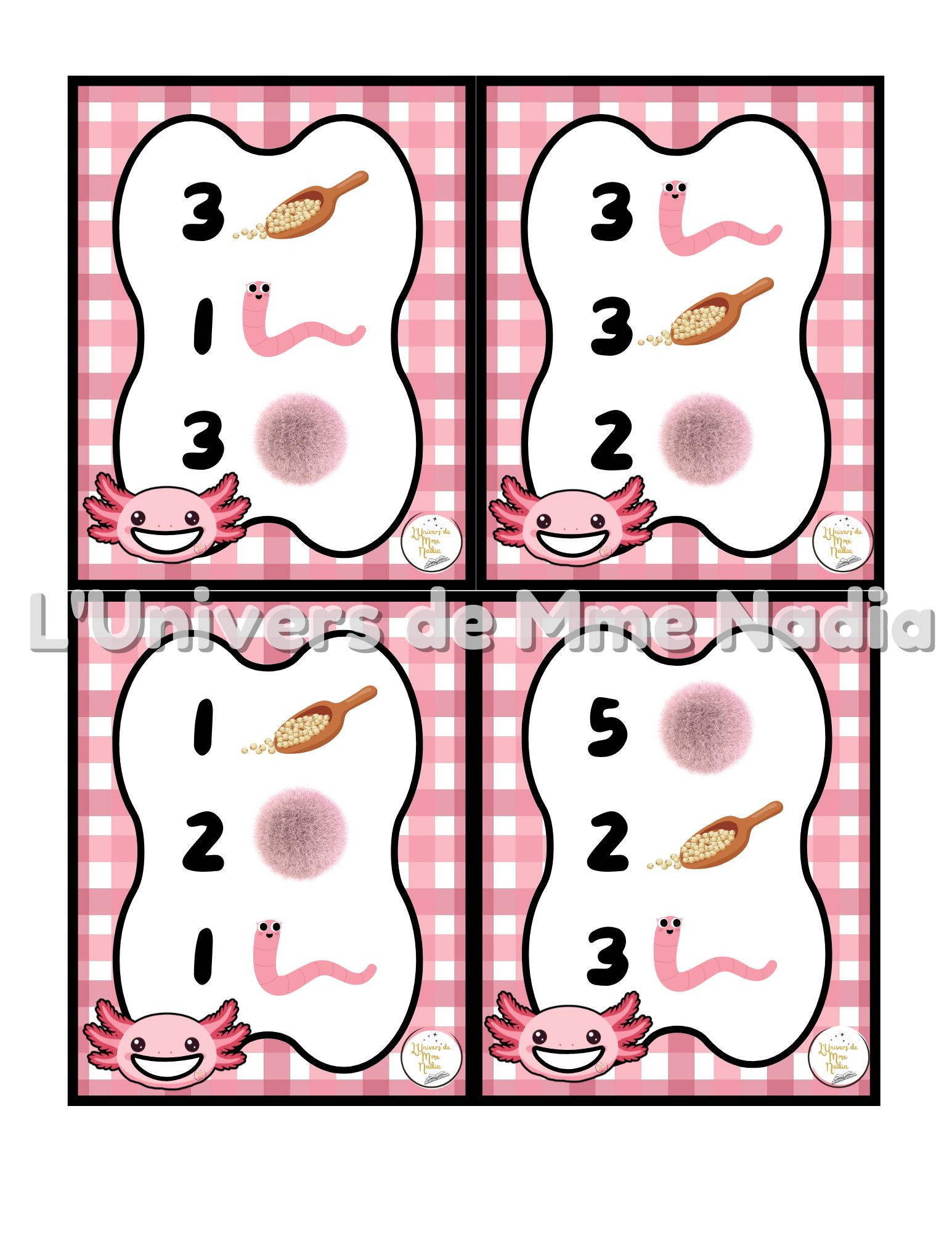 Axolotl a faim est un jeu complémentaire au plateau J'ai faim, créé par Ébénisterie Steve Genesse. Le jeu comprend 1 tête d'Axolotl, 12 vers de terre et 32 petits menus conçus pour nourrir l'Axolotl de façon ludique et éducative. Chaque carte propose un menu à réaliser avec différents éléments : • des vers de terre, • des pompons, • et la possibilité d'ajouter des cuillères de mélange sensoriel. Les enfants sont invités à : • choisir le bon ingrédient, • mettre la bonne quantité, • et suivre les consignes du menu. Ce jeu permet de travailler les quantités, l'association, l'attention et la motricité fine, tout en ajoutant une dimension sensorielle et amusante. Avec ses 32 cartes toutes différentes, Axolotl a faim offre une belle variété de défis pour enrichir l'utilisation du plateau J'ai faim.